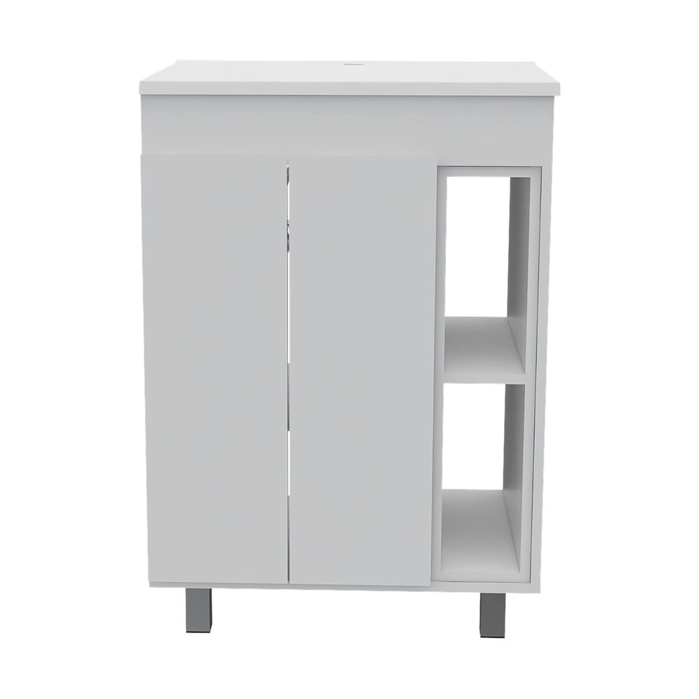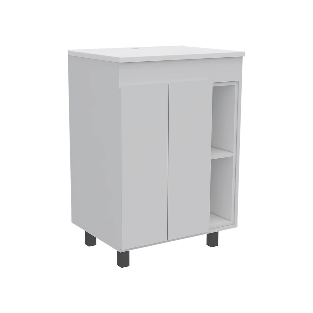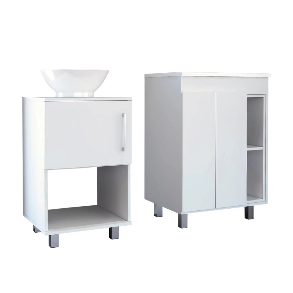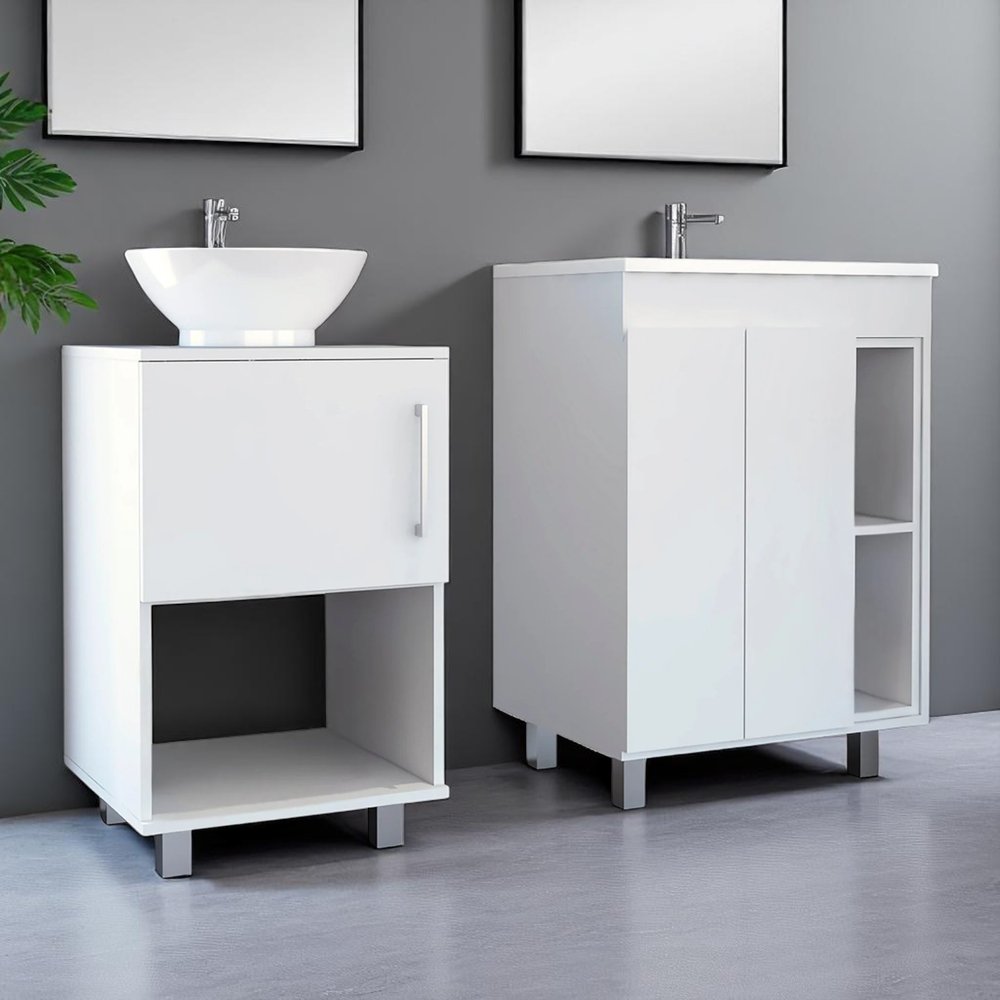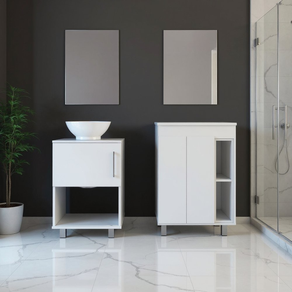 El juego de dos tocadores de baño independientes de madera blanca con lavabo blanco ofrece una estética elegante y moderna para su baño. Fabricado con madera resistente, este tocador garantiza una larga vida útil y un toque de estilo. Su impecable acabado blanco aumenta su versatilidad, complementando diversos estilos de decoración. Cada unidad incluye un lavabo blanco a juego para una apariencia cohesiva, haciendo de su rutina matutina una experiencia perfecta. Diseñado con puertas funcionales, ofrece amplio espacio de almacenamiento para todos sus artículos esenciales. La instalación estándar independiente permite una fácil colocación en cualquier diseño de baño. Además, este juego cuenta con elegantes tiradores de metal blanco para cajones, que le aportan un toque contemporáneo y garantizan una fácil instalación. Transforme su baño con este tocador de hermoso diseño. 86 cm de alto x 60 cm de ancho x 45 cm de profundidad.