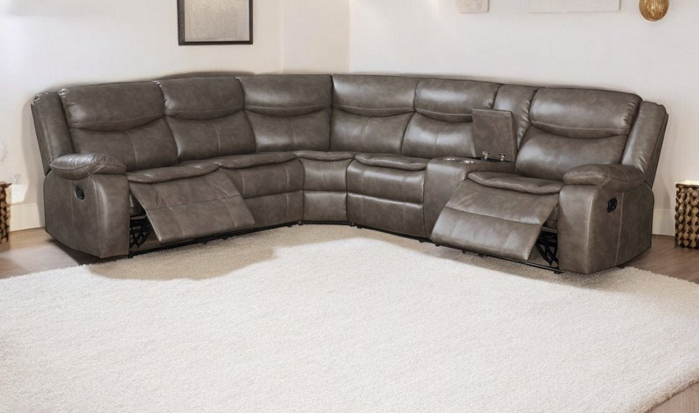 Seccional esquinero reclinable en forma de L de seis piezas de piel sintética color topo con consola