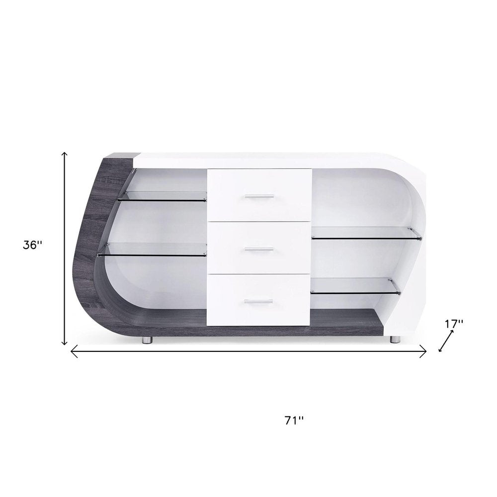 Space constraints in your dining area? Then this versatile storage buffet is the solution to all your home decorating needs. Unusual It are the hallmark of this ultra-contemporary buffet, making it immediately the eye-catching focal point of your entertainment/dining area. Storage problems disappear thanks to this buffet's abundant shelf space and drawers. Incorporating solid woods and veneers in a multi-toned White and Grey, this buffet is an easy fit for many room decors and will add drama and sophistication to any room environment. Quality construction ensures durability and long-lasting wear. This buffet is a smart choice for the discerning shopper and will give you the flexibility you need without sacrificing unique appeal.