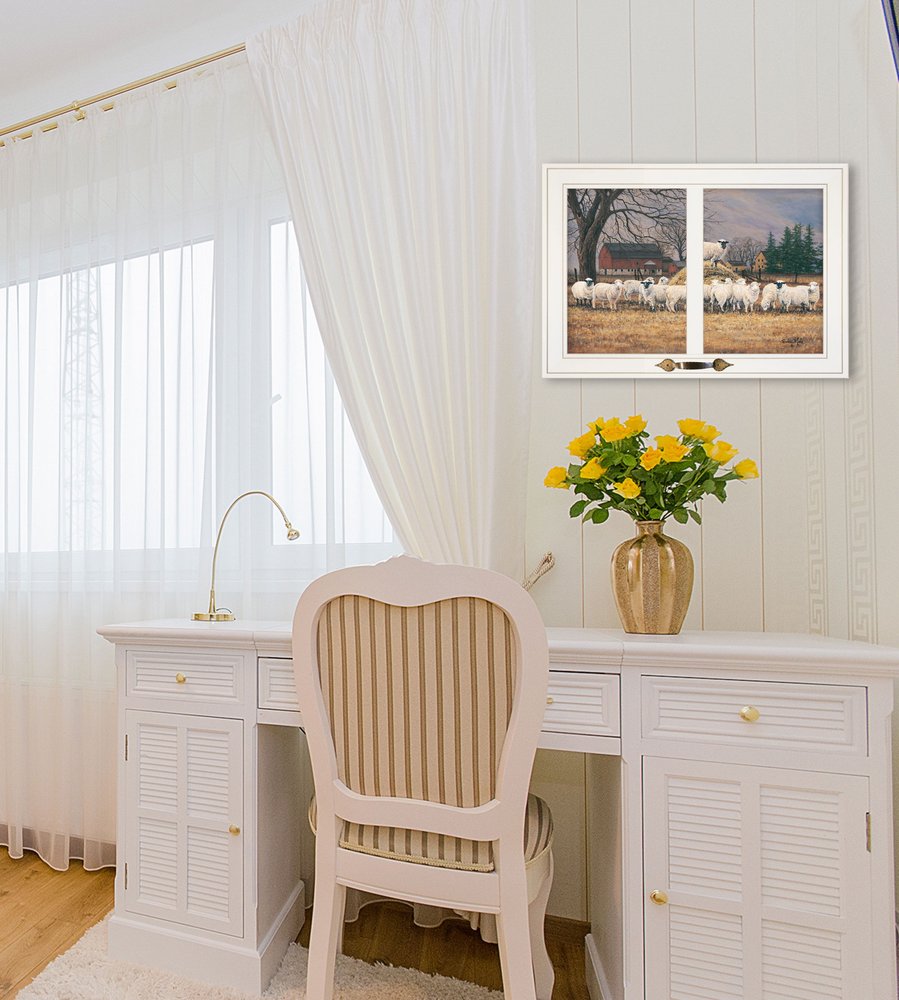 This wool gathering 2 white framed print wall art will add a beautiful decorative accent to your decor. This print is a visual artistic expression that allows you to decorate your space in style. Reproduced for you on paper, this hanging decorative accent will be a trendy and fashionable way to dress your walls. Hang on your wall to add some up-to-date fashion and decoration. Utilize this opportunity to create a focal point in the room with this fabulous wall decor option. 15-inch H x 21-inch W x 1.5-inch D
