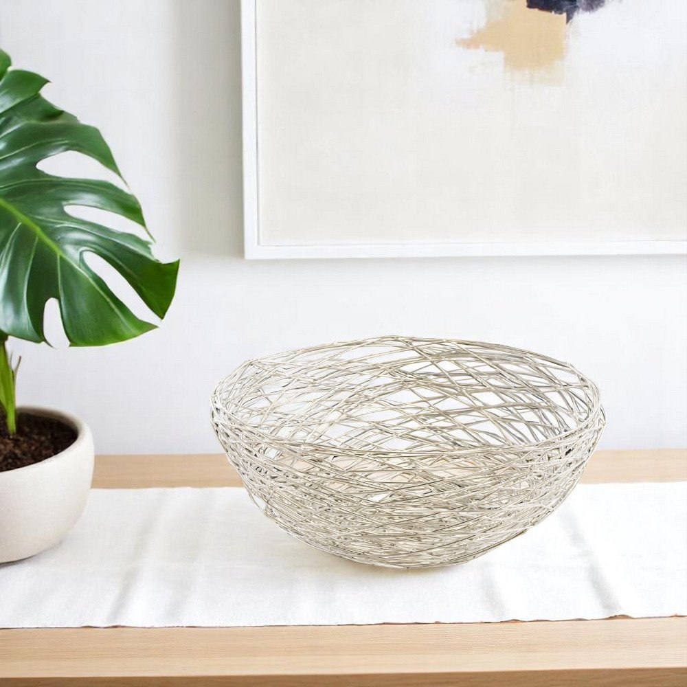 Bring a contemporary, yet classic, style to the air and feeling of your home as you energize your space with this dazzling and stunning Abstract Silver Wire Centerpiece Bowl. It will definitely show the uniqueness and complexity of your style. It's a perfect addition for those who love an up-to-the-minute look and feel. This elegant yet casual silver wire bowl is expertly made of high-grade nickel-plated aluminum wire. 5.5-inch H x 12-inch W x 12-inch D