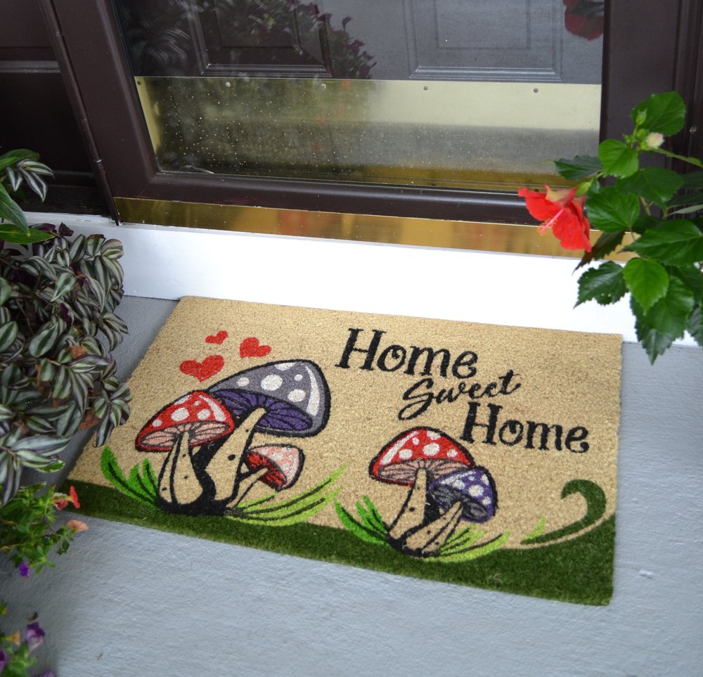 Known for it's extreme durability and ability to withstand heavy foot traffic, this 18-inch x 30-inch beige and black coir mushrooms home sweet home outdoor door mat is an ideal option for the front door or entrance way of your home or business. Crafted from coconut husks, this mat is not only functional but is an an eco-friendly and visually appealing accessory. The naturally bristled texture of coir is an efficient way to clean dirt and mud from shoes and is easy to clean and maintain. Add this decorative mat to create a practical yet inviting welcome to all who enter. 18-inch H x 30-inch W x 0.5-inch D