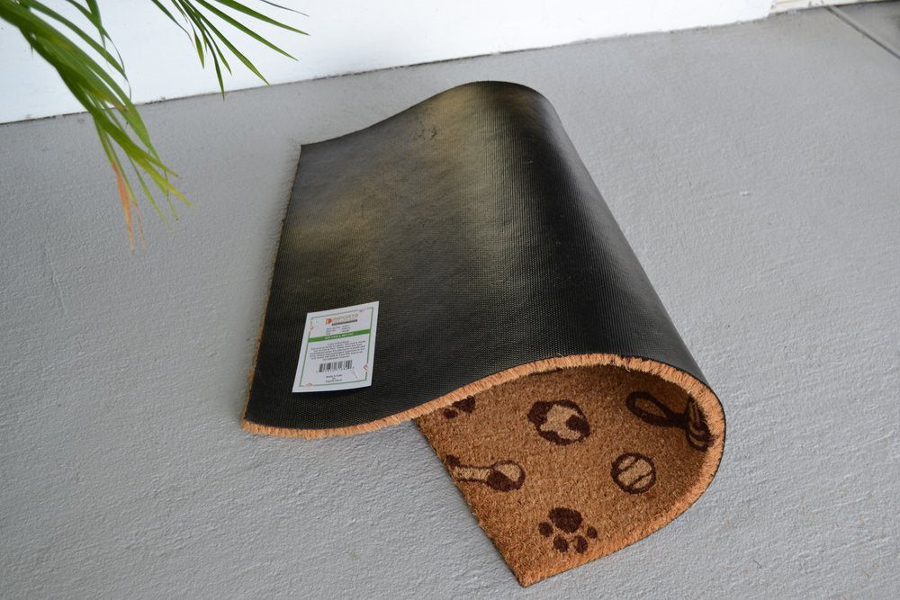 Known for it's extreme durability and ability to withstand heavy foot traffic, this 18-inch x 30-inch beige and white coir dog outdoor door mat is an ideal option for the front door or entrance way of your home or business. Crafted from coconut husks, this mat is not only functional but is an an eco-friendly and visually appealing accessory. The naturally bristled texture of coir is an efficient way to clean dirt and mud from shoes and is easy to clean and maintain. Add this decorative mat to create a practical yet inviting welcome to all who enter. 18-inch H x 30-inch W x 0.5-inch D