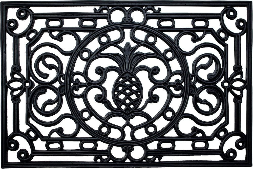 Ready to withstand heavy foot traffic, this 24-inch x 36-inch black pineapple and scrollwork outdoor rubber door mat is an ideal option for the front door or entrance way of your home or business. Crafted from rubber, this mat is not only functional but is a visually appealing accessory to welcome people to your home or business. Add this decorative mat to create a practical yet inviting welcome to all who enter. 24-inch h x 36-inch w x 0.4-inch d.