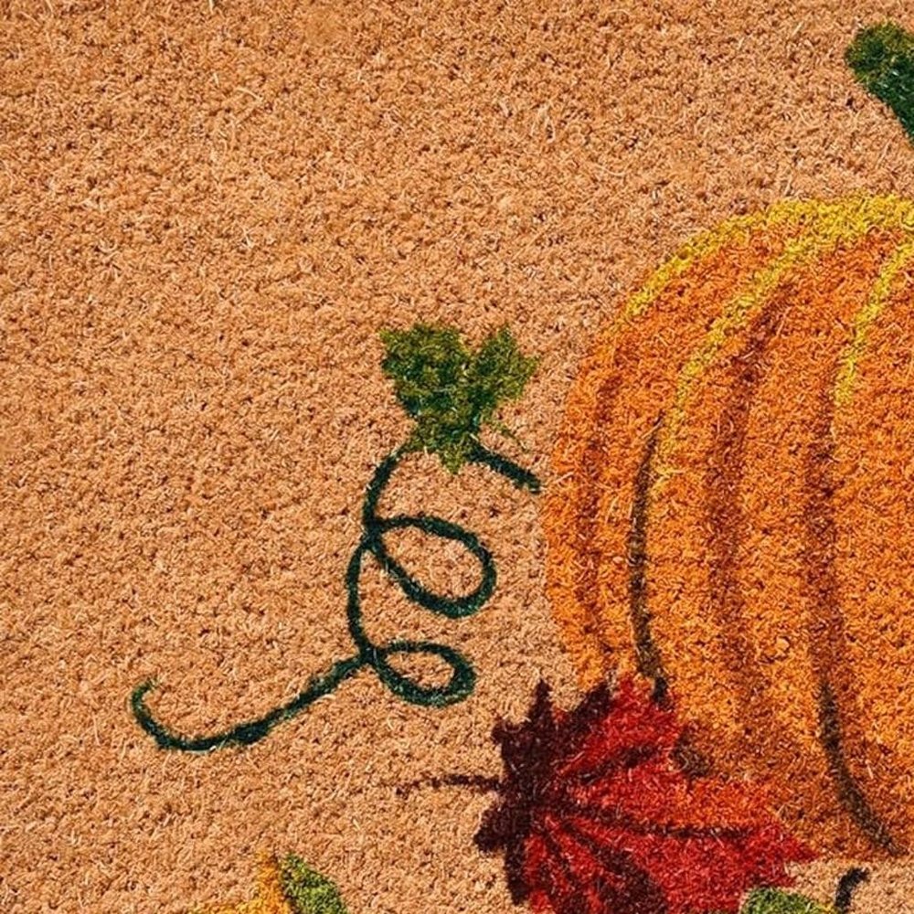 Known for it's extreme durability and ability to withstand heavy foot traffic, this 24-inch x 36-inch natural and orange coir pumpkin outdoor fall door mat is an ideal option for the front door or entrance way of your home or business. Crafted from coconut husks, this mat is not only functional but is an an eco-friendly and visually appealing accessory. The naturally bristled texture of coir is an efficient way to clean dirt and mud from shoes and is easy to clean and maintain. Add this decorative mat to create a practical yet inviting welcome to all who enter. 24-inch h x 36-inch w x 0.6-inch d.