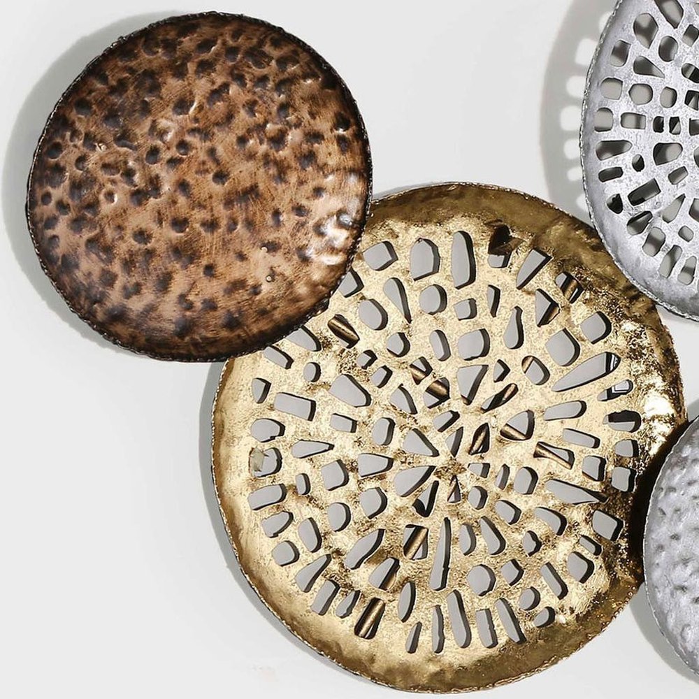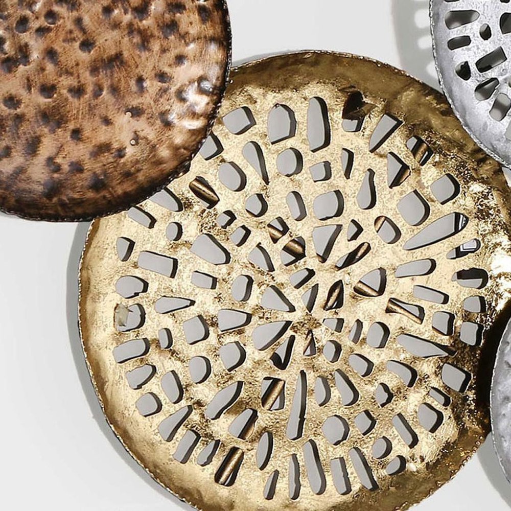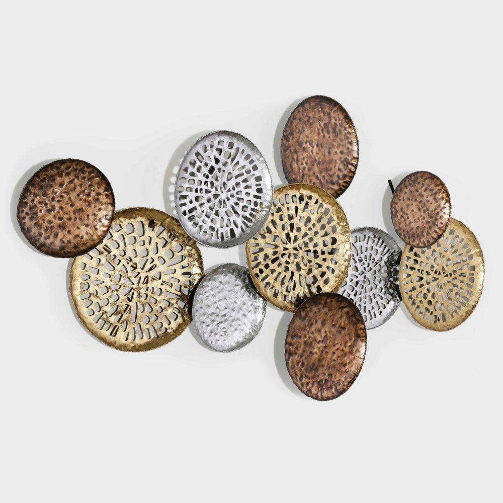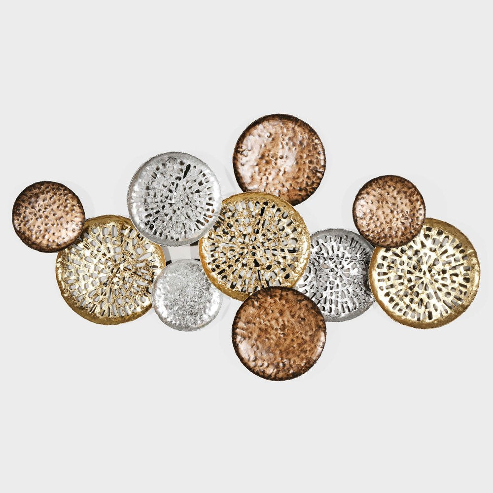 33" X 60" Bronze Gold and Silver Metal Round Disc Hanging Dimensional Sculpture