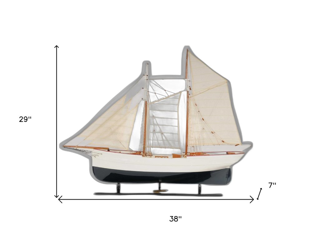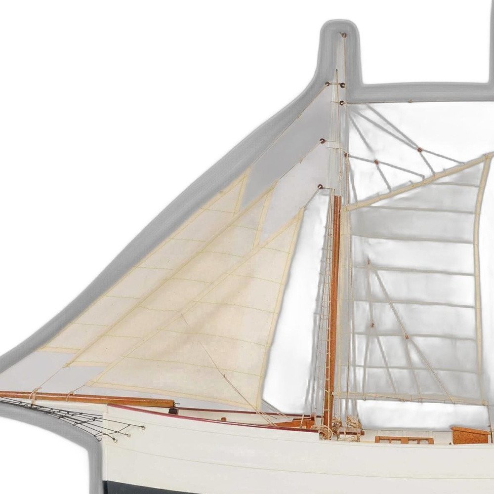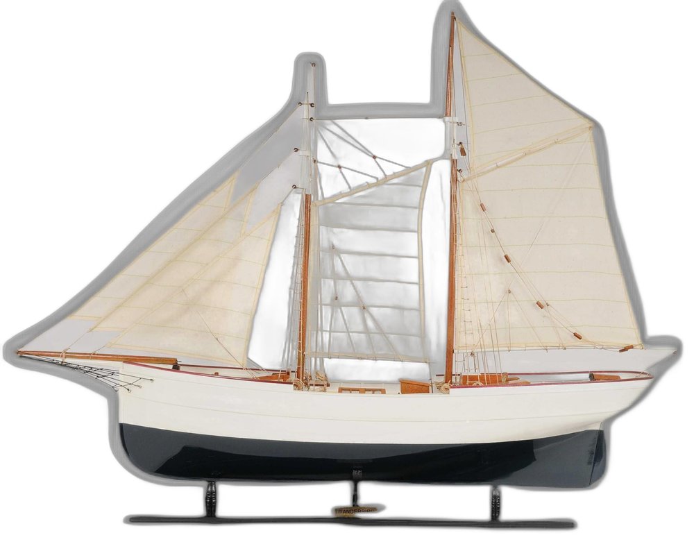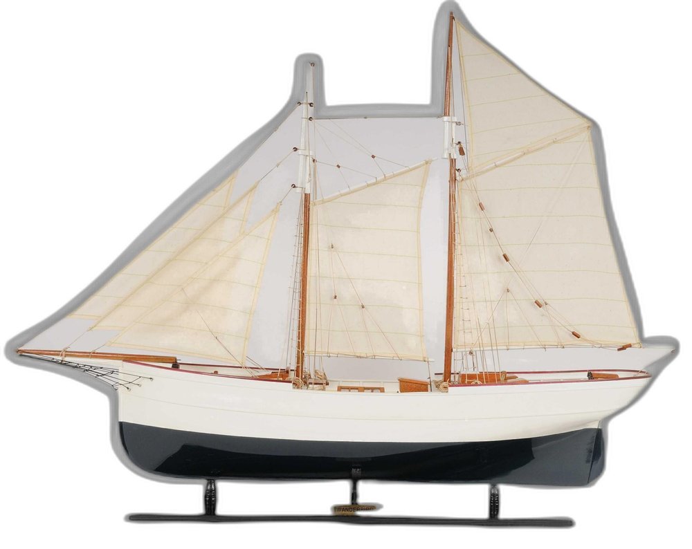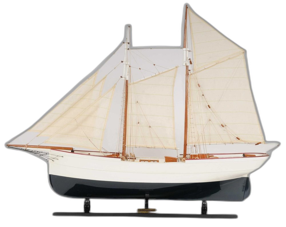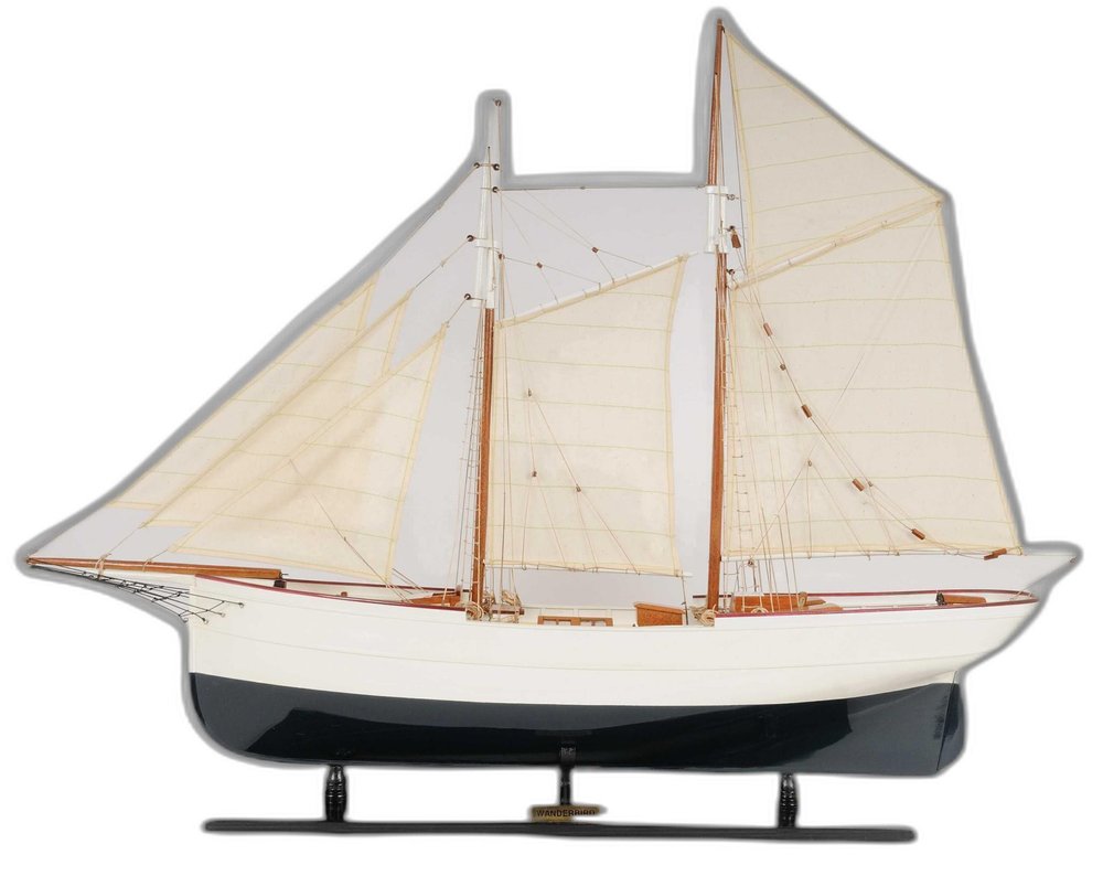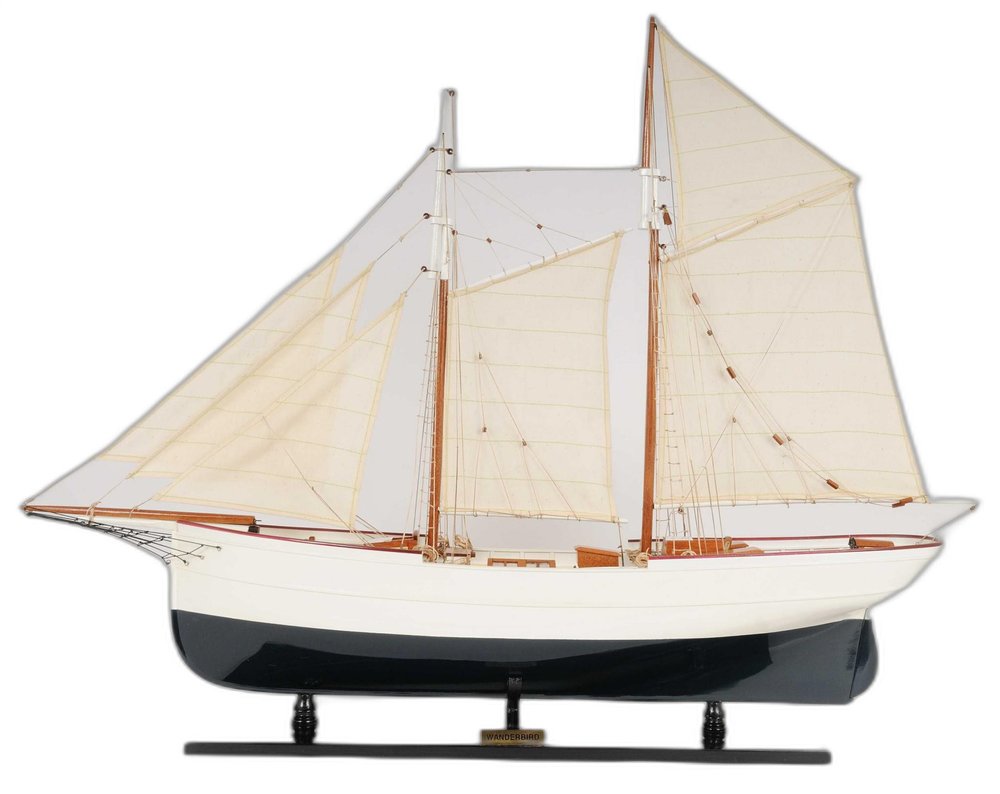 This is Museum-quality, Fully Assembled edition of the Wanderbird. The model is 100% hand built from scratch using plank on frame construction method. Our master craftsmen have spent more than 100 hours to finish it. Made of Mahogany and painted in white and very dark blue(closer to black). This replicas magnificent details include metal steering wheel, skylight, deck houses, advanced intricate rigging, full cloth sails with detail stitching, wood inlay deck and many more. Comes on a solid wood base, with metal nameplate.
