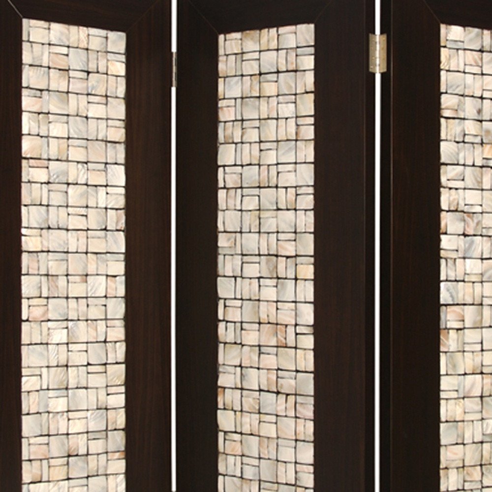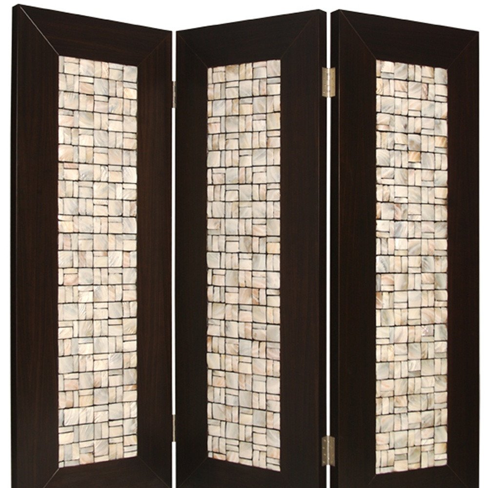 this 3 panel wood screen is all you need to carve out space in your room or anywhere around the home. not only will this elegant piece give you the needed exclusivity but it will also add style and beauty to your decor. featuring a unique square pearl pieces arranged in a charming rectangular pattern and framed by a solid wood structure with brown finish. overall, our 3 panel screen is designed to fill your space with inspiring visual flair for many years to come. 3 panel screen stunning rectangular pattern finished on both sides inlayed pearl shell design