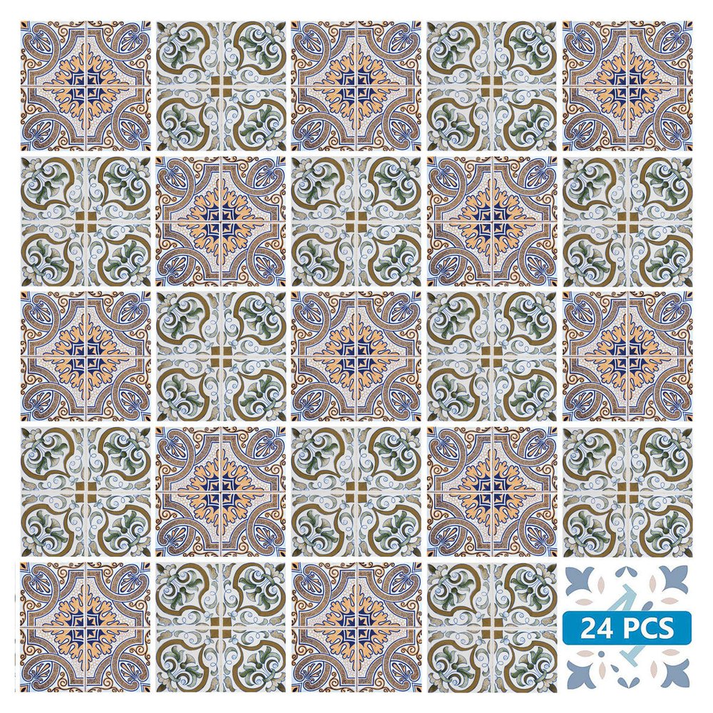The possibilities are endless with these 8" x 8" Blue Mia Peel and Stick Removable Tile stickers. These fabulous peel and stick tiles will add lots of color, sophisticated flair, and fun design to your kitchen backsplash, fireplace mantel, stair treads, half wall, bathroom or nook. These 8" square tile stickers in multiple bright fun colors and designs are an easy, no mess solution to complete a personalized and colorful room makeover. Easy to apply on any clean dry flat surface, and easy to remove. Multi use and multi-room appeal make this design option is perfect for renters, landlords, college students and homeowners alike. Peel and stick tile decals make it easy to turn your space into a home. Removable without damage to surfaces. One kit contains 24 stickers. Kit includes single design style.