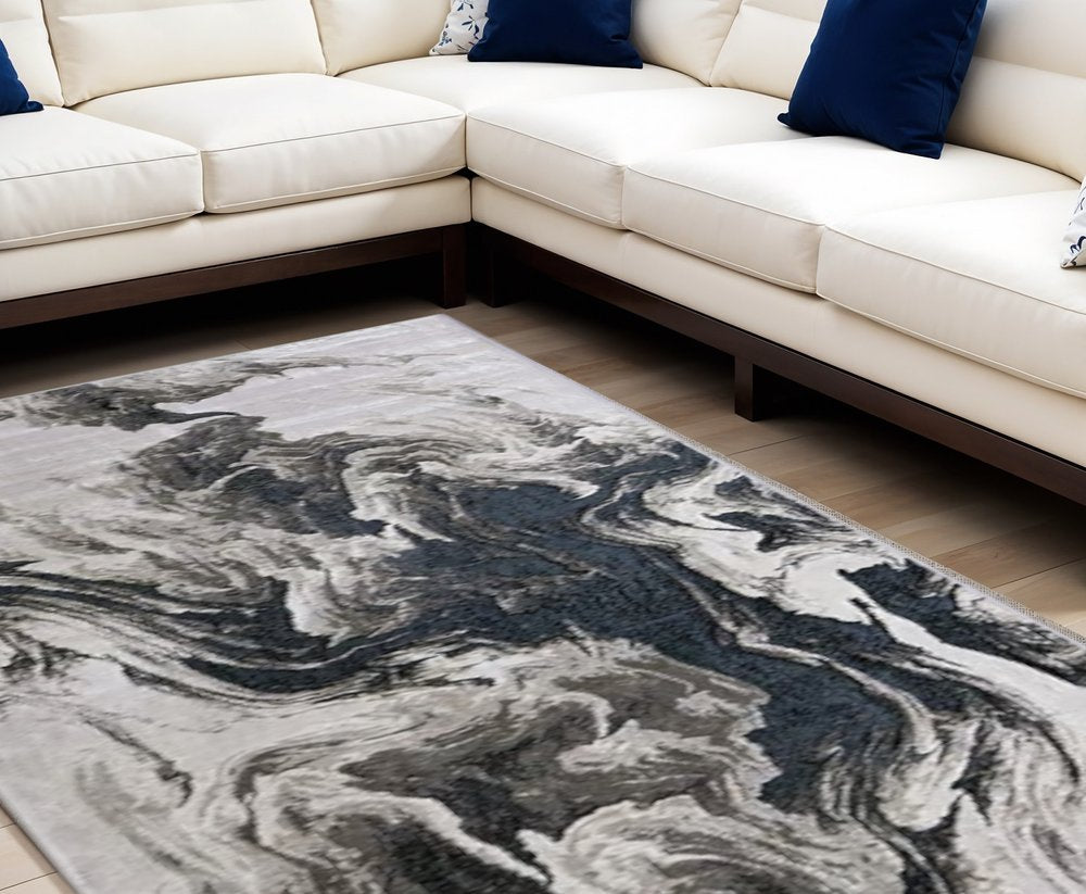 This 9-foot x 12-foot ivory black and taupe abstract power loom area rug, is a great way to add warmth to a room. This rectangle shaped rug features a abstract design that will add a functional and decorative accent to your space. Ideal for spaces with kids and pets, this rug is stain resistant to help repel dirt and spilled liquids. This larger sized rug is ideal to create a focal point or statement piece in your room. 110-inch h x 144-inch w x 0.39-inch d