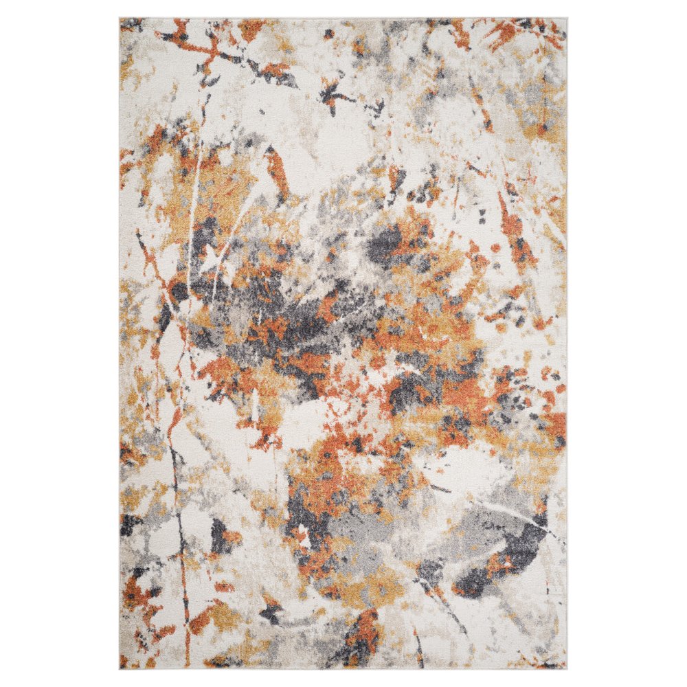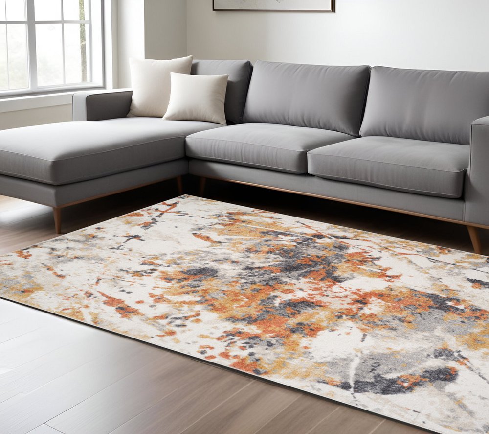 Add some artistry to your room with this 9-foot x 12-foot ivory orange and gray abstract area rug. Ideal for spaces with kids and pets, this rug is stain resistant to help repel dirt and spilled liquids. Built to last, this rug crafted from polypropylene fibers is known for its durability and long lasting appeal. Rugs are a great way to showcase your style, hide imperfections, warm your home and reduce noise. This larger sized, modern styled rug is ready to create a focal point or statement piece in your room. 106.00-inch h x 141.00-inch w x 0.30-inch d.