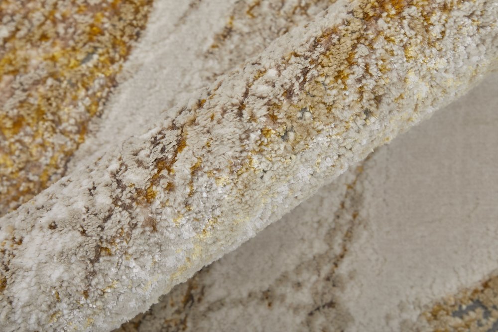 Add great coloration and comfortable texture to your space with this 9-foot x 12-foot ivory taupe and gold abstract area rug. Ideal for spaces with kids and pets, this rug is stain resistant to help repel dirt and spilled liquids. Rugs are a great way to showcase your style, hide imperfections, warm your home and reduce noise. This larger sized, industrial styled rug is ready to create a focal point or statement piece in your room. 110-inch h x 144-inch w x 0.39-inch d.