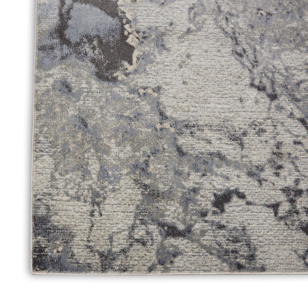 Add some artistry to your room with this 9-foot x 13-foot gray black and ivory abstract area rug. Ideal for spaces with kids and pets, this rug is stain resistant to help repel dirt and spilled liquids. Built to last, this rug crafted from polyester fibers is known for its durability and long-lasting appeal. Rugs are a great way to showcase your style, hide imperfections, warm your home and reduce noise. This smaller sized, modern styled rug is just what you need for your walkway, bedside, in front of door, cabinet, refrigerator, or chair. 111-inch h x 153-inch w x 0.5-inch d.