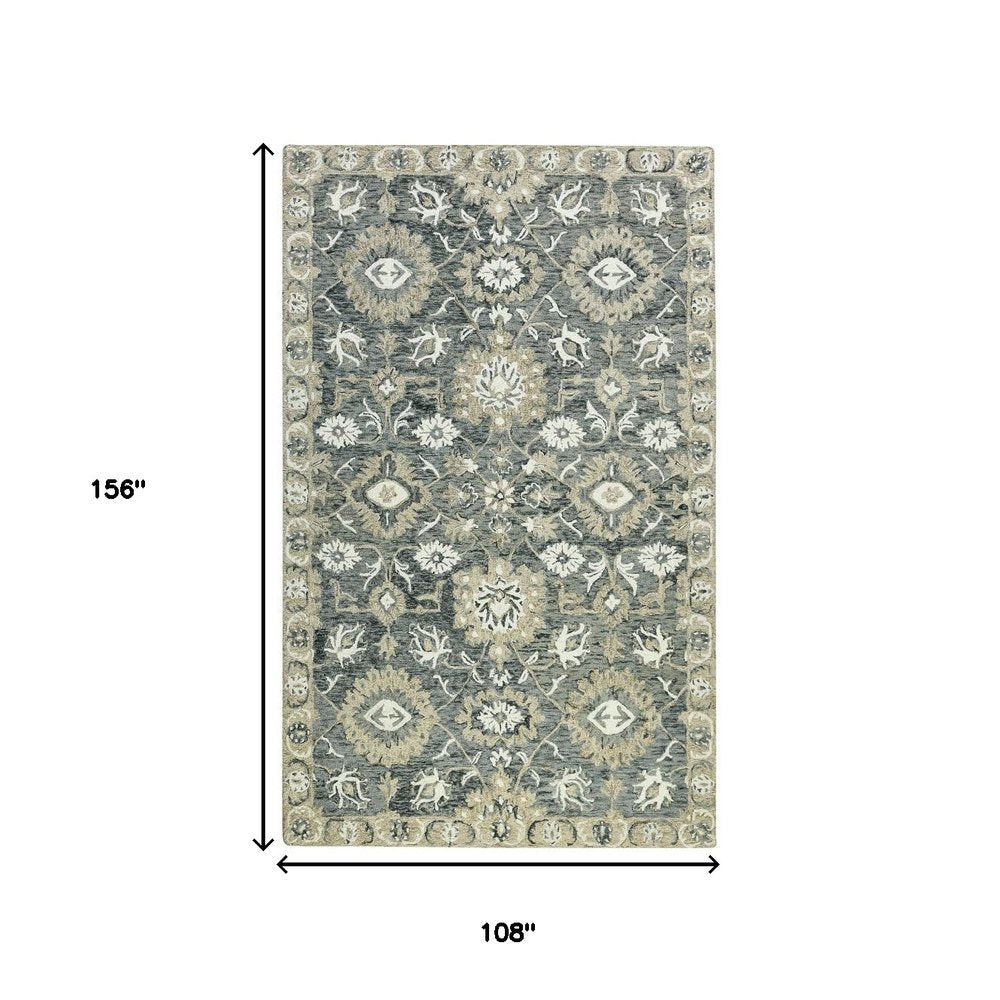 9' X 13' Gray Ivory And Beige Wool Floral Medallion Hand Hooked Area Rug
