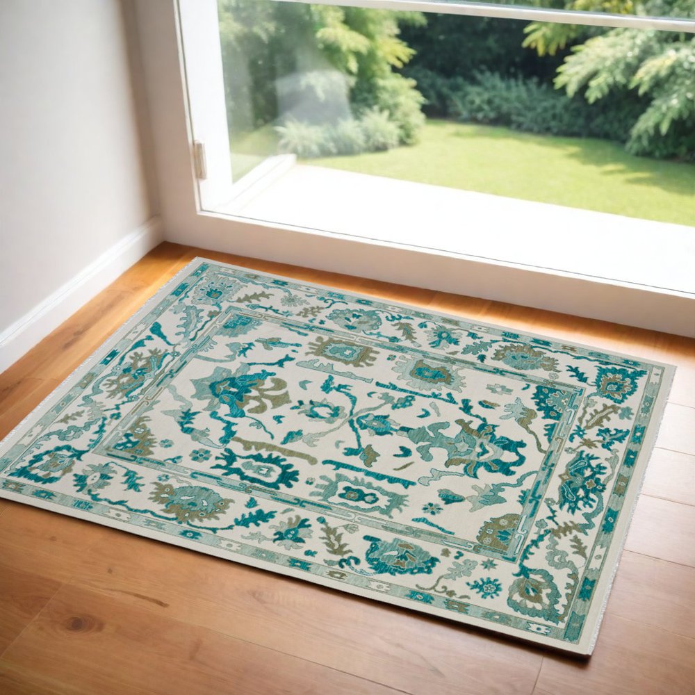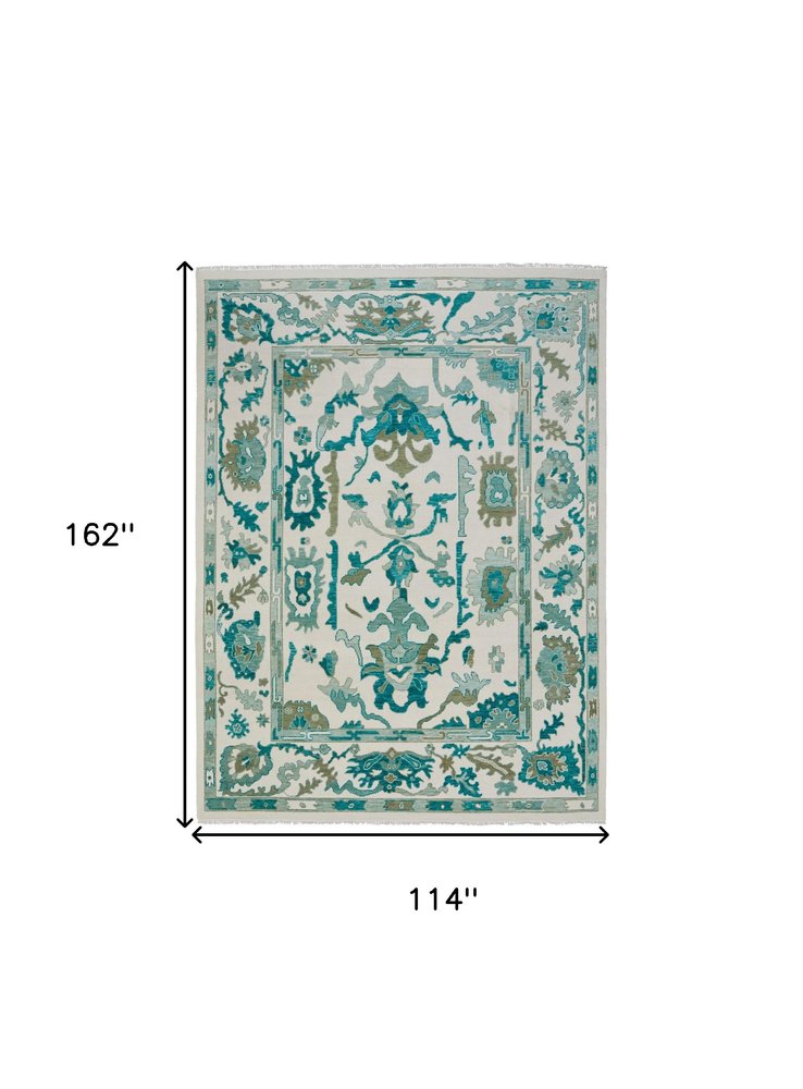 9' X 13' Green and Ivory Wool Floral Hand Knotted Area Rug With Fringe