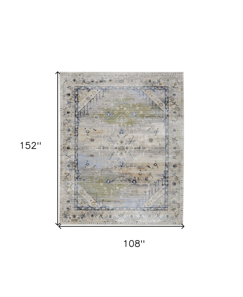 9' X 13' Ivory Green and Blue Abstract Power Loom Worn Faded Area Rug