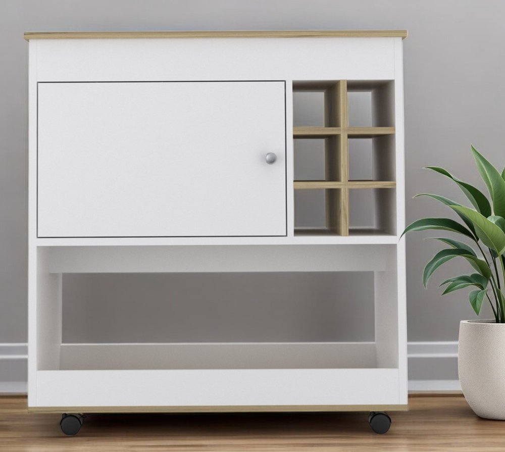 This brown and white rolling bar cart with wine storage is the perfect addition to your modern decor. With its sleek design, this freestanding bar cart features a display stand cabinet that includes storage cabinets and shelves. The rectangular shape, made from particle board and manufactured wood, provides a standard cabinet design. Equipped with wheels, this bar cart offers easy mobility for serving your guests. The brown and white color combination adds a touch of elegance to any space. Plus, it includes wine storage that can hold up to six wine bottles, allowing you to keep your favorites close at hand. Upgrade your entertaining area with this stylish and functional bar cart. 37.4-inch H x 35.4-inch W x 18.5-inch D