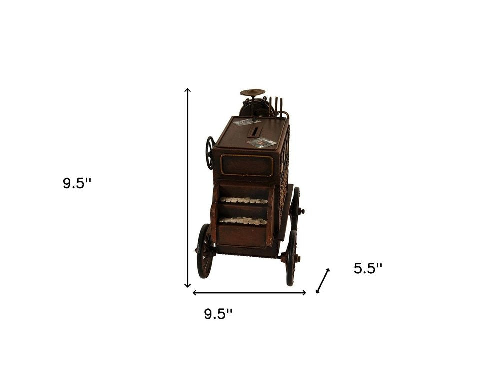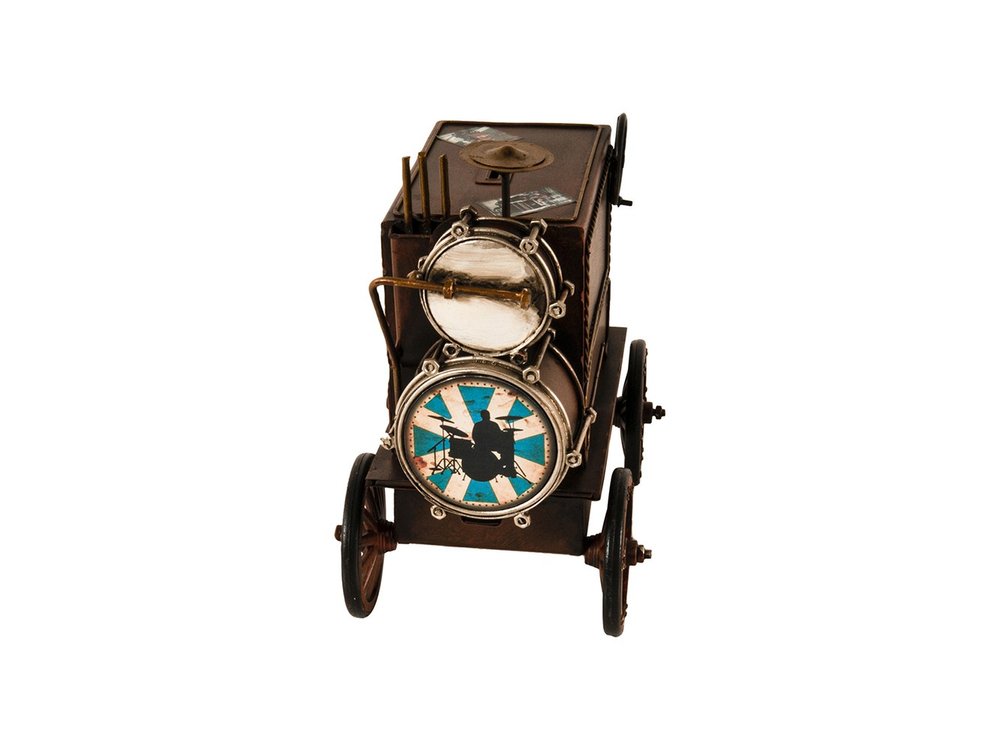 Charming and eye-catching, the Music Car Coin Bank is a unique handmade metal replica of romantic music cars. It features a miniature keyboard, drums, cymbals, and organ pipes. It also doubles as a coin bank. It is a beautiful and practical gift. 9.5'' x 9.5'' x 5.5"
