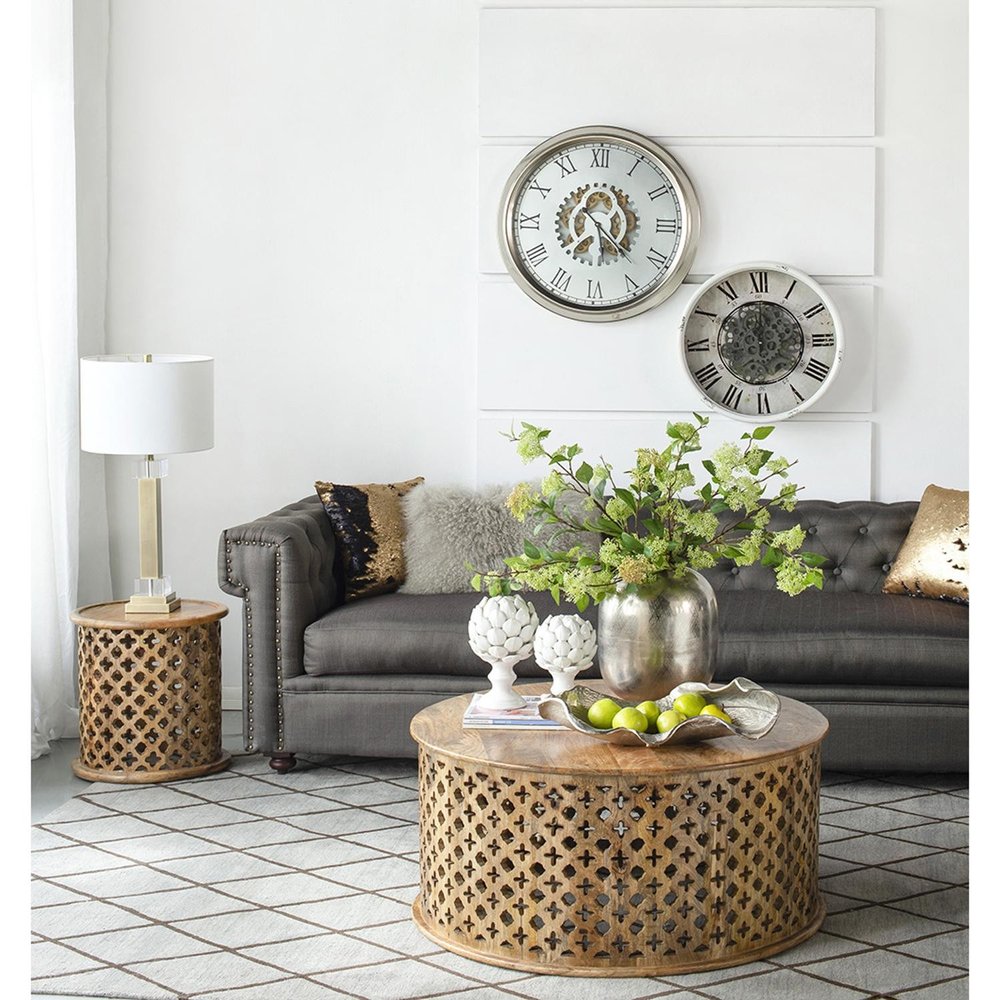 Characterized by the beauty of the Roman style with a modern flair, this Rustic White Industrial Gear Vintage Wall Clock accentuates a fine fusion of the old and new in its design elements. It exhibits a distressed white metal frame with a transparent glass face that flanks the bold Roman numerals in a ring while the tiny hands are housed over a pile of gears at the center for visual interest. Embracing the aesthetic of the industrial era with a contemporary touch, this stunning wall clock will work well with a wide variety of interior themes and decors. 19.7” x 19.7” x 5.3”
