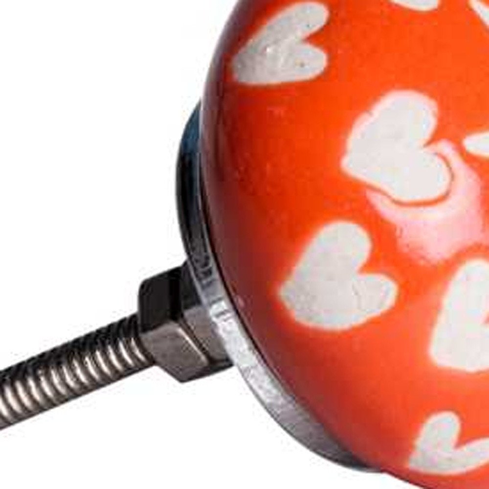 Upgrade your space with a high end look with this set of twelve orange white and silver floral ceramic drawer pull knobs. Improve the look of your old boring or builder grade furniture and cabinetry with these high-quality round knob transitional style knobs. Hand-painted by talented artisans, these knobs will add a touch of artisanal design. 1.5-inch h x 1.5-inch w x 1.5-inch d.