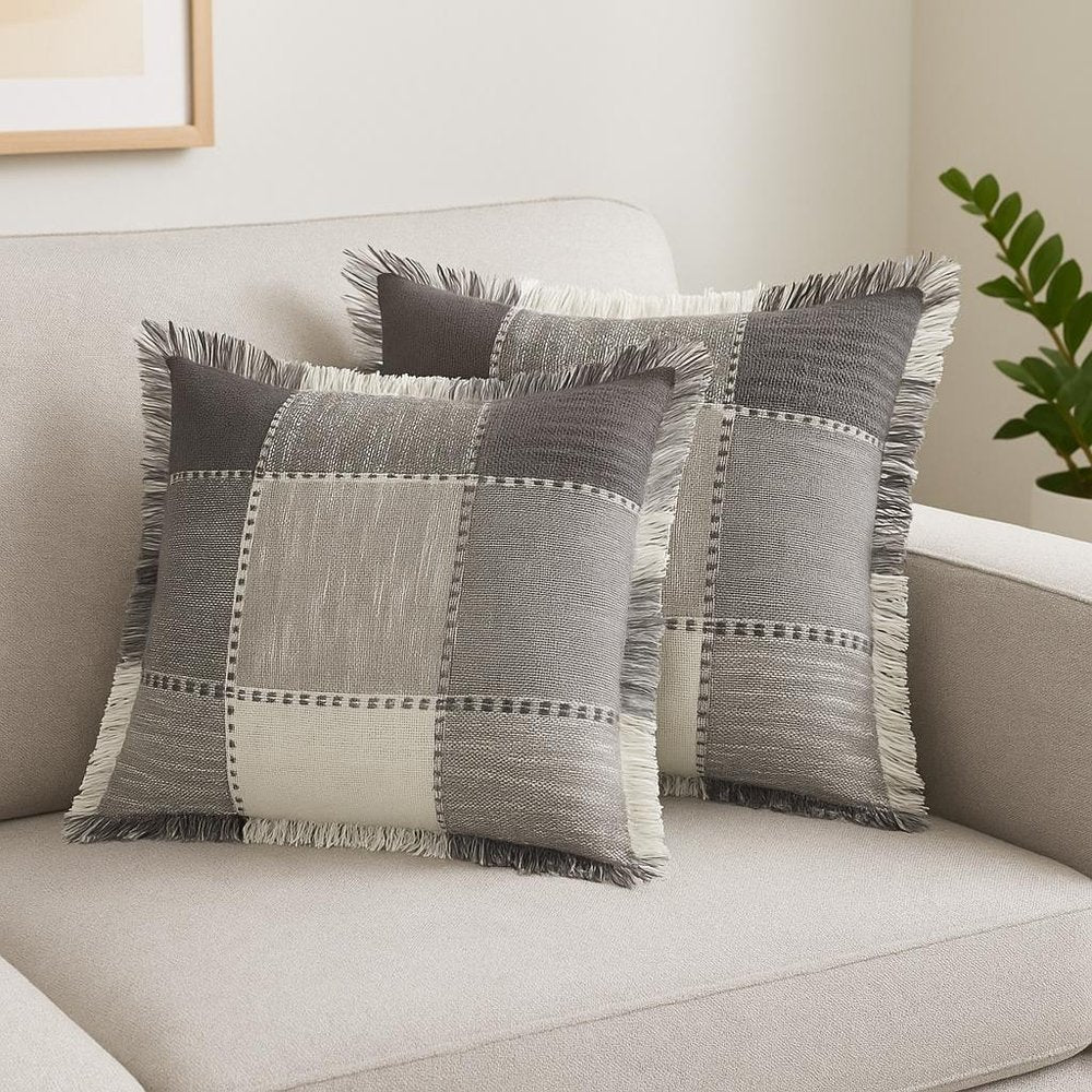 The perfect complement to your sofa, favorite chair, or bed, this set of two 20-inch gray and off white plaid cotton blend throw pillows with fringe is a great decorative accent. This soft polyfill filled pillow not only is decorative but made to be comfy and cozy all day long. Decorative pillows are a great way to change up the look and feel of your space easily and quickly. Decorative throw pillows not only add color and dimension to your space but can be comfy and supportive when you are lounging and cuddling as well. 20-inch h x 20-inch w x 4-inch d.