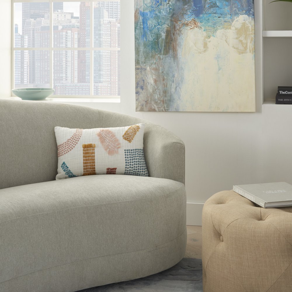 This 12-inch x 20-inch beige blue and ivory geometric cotton throw pillow with textured appliques will add a beautiful decorative accent to your decor. The pillow has a rectangular shape and is covered in a woven cream colored cotton. Atop this cream background, there are multi-colored colored stitch detail embellishments that add depth and texture to the overall look. Filled with soft polyester, this pillow not only is decorative but made to be comfy and cozy all day long. 12-inch H x 20-inch W x 5-inch D