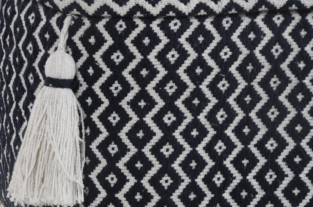 Optimize your space and add some charm to your room with the 18-inch blue cotton geometric pouf ottoman. Add chic style to your space with this fun pouf that not only looks cool but can be a great foot rest or extra seat when needed. Expertly upholstered with padding and soft 100% cotton in a geometric pattern, this ottoman is as comfortable as it is good looking. Easy to blend into most any room, a ottoman is a way to add a good looking accent to your space that can also be practical and useful. 14-inch h x 18-inch w x 18-inch d.