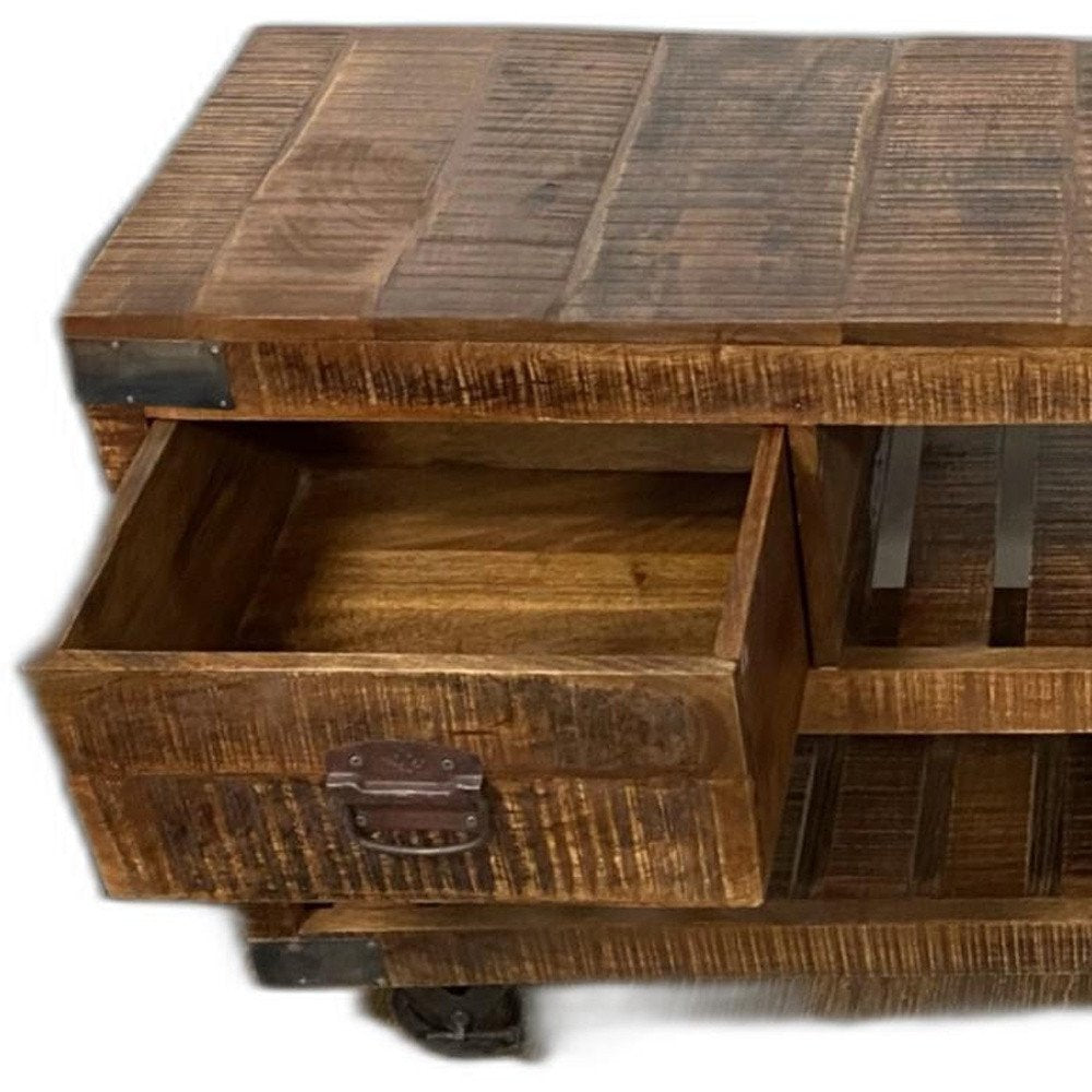 18" Brown and Black Solid Wood Distressed Wheel Console Table With Shelves And Drawers