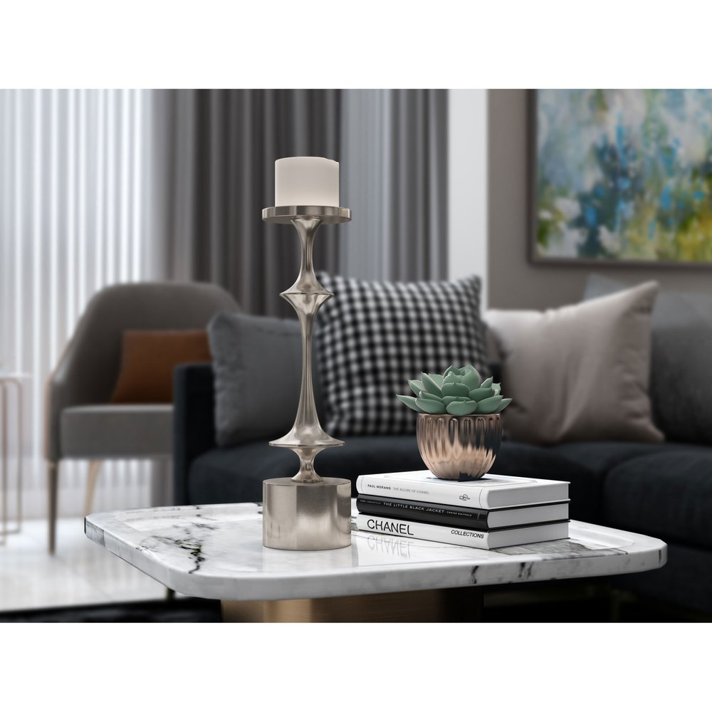 This 18-inch silver distressed geometric metal tabletop candle holder is a great addition to your home decor. existing furniture. Add an extra pop of personality to every corner of your home with this gorgeous geometric tall pillar holder. Designed to accommodate 3-inch wide pillar candles, this contemporary piece effortlessly enhances any tabletop setting with its striking geometric pattern. Perfect for bringing warmth and elegance to your living space, this metal candlestick holder is a must-have accent. 18-inch h x 5-inch w x 5-inch d.