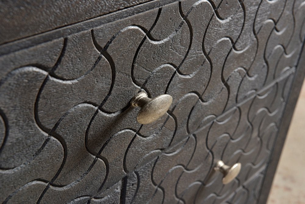 Good looking design and practical styling meet to form this 30-inch gray solid wood four drawer nightstand. Robust in design, the bed side table has been expertly crafted from solid wood. The unsung hero of the bedroom, this nightstand is perfect for keeping a glass of water, lamp, alarm clock, jewelry, and more, close by and easily accessible. Nightstands are obviously great beside the bed but can be used just as easily to help battle clutter in your living room, hallway, office, or dining room. 30-inch h x 36-inch w x 18-inch d.