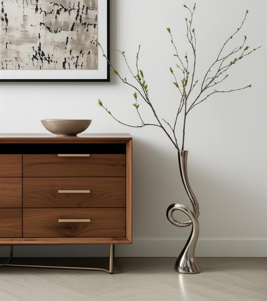 The 39-inch silver trumpet aluminum floor vase is a stunning addition to any home decor. Crafted from high-quality aluminum, this floor vase boasts a sleek and contemporary design that enhances your living space. Its trumpet shape adds a touch of elegance, making it perfect for displaying your favorite flowers or simply standing as a striking decor piece. The modern style complements various interior aesthetics, from minimalist to eclectic. This versatile vase can be placed in entryways, living rooms, or dining areas, effortlessly elevating your home's ambiance. With its reflective silver finish, it captures light beautifully, adding a bright and airy feel to your surroundings. Bring sophistication and charm into your home with this exquisite floor vase. 38.5-inch h x 10-inch w x 6.75-inch d.