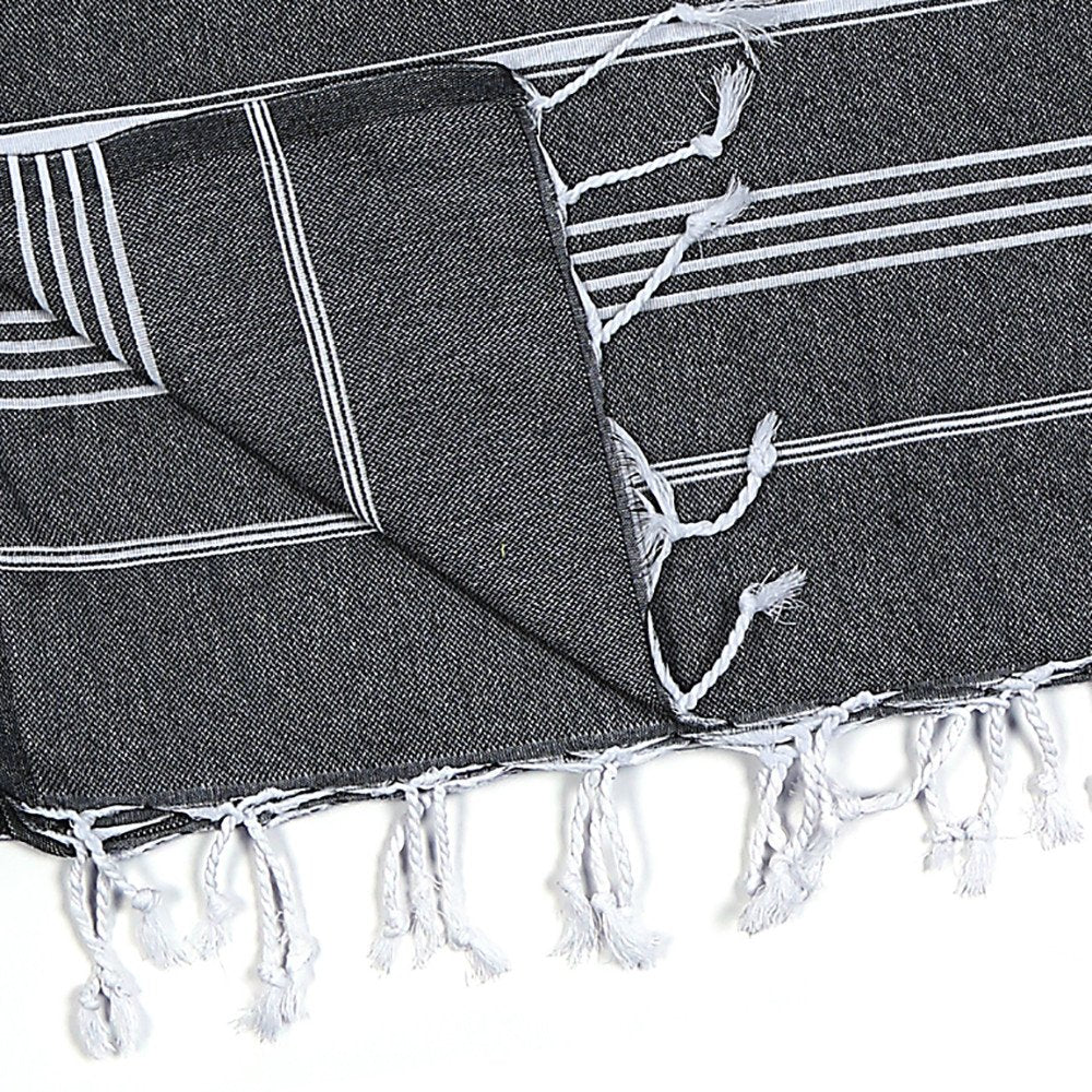 This 39-inch x 71-inch white and black cotton Turkish towel throw blanket with tassels is the perfect accent you've been searching for. This versatile blanket can be used as a throw blanket, picnic blanket, beach blanket, even bath towel. This cozy blanket makes the perfect add-on to movie nights and lazy afternoons. Featuring a plain weave in a striped pattern, this throw blanket is a lightweight layer for all seasons. Made from cotton this blanket will make a great addition to any room it's added to. 71-inch h x 39-inch w x 0.02-inch d