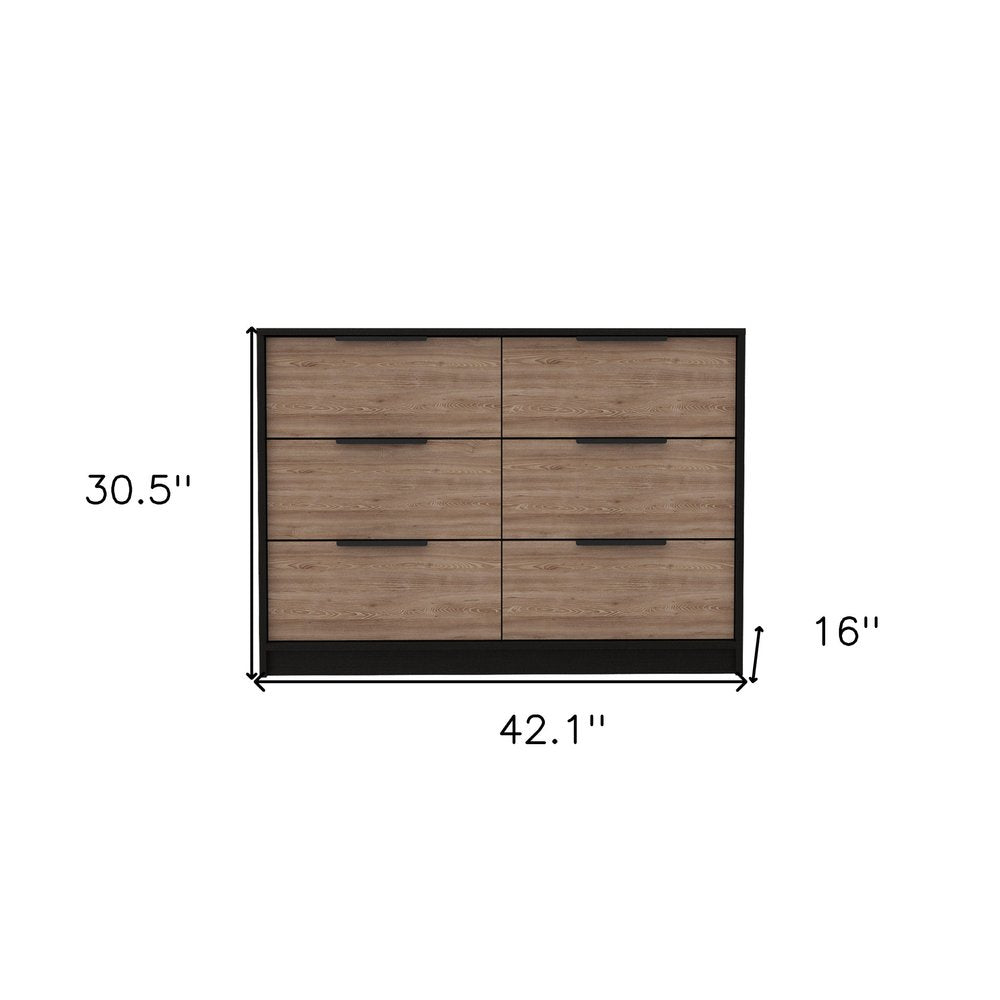 Enhance your room into a visually delightful and highly functional space with this 42-inch brown and black six drawer double dresser. This horizontal double dresser has column style drawers and a wide top surface area to help you with your daily dressing essentials. Loaded with capacity, this piece is equipped with six easy open drawers for practical and good looking clothing storage. Its a high quality piece, made from high grade manufactured wood. 30.5-inch H x 42.1-inch W x 16-inch D