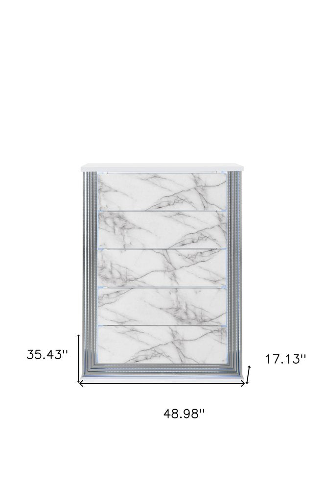 49" Silver And White Wood Faux Marble Lighted Five Drawer Dresser