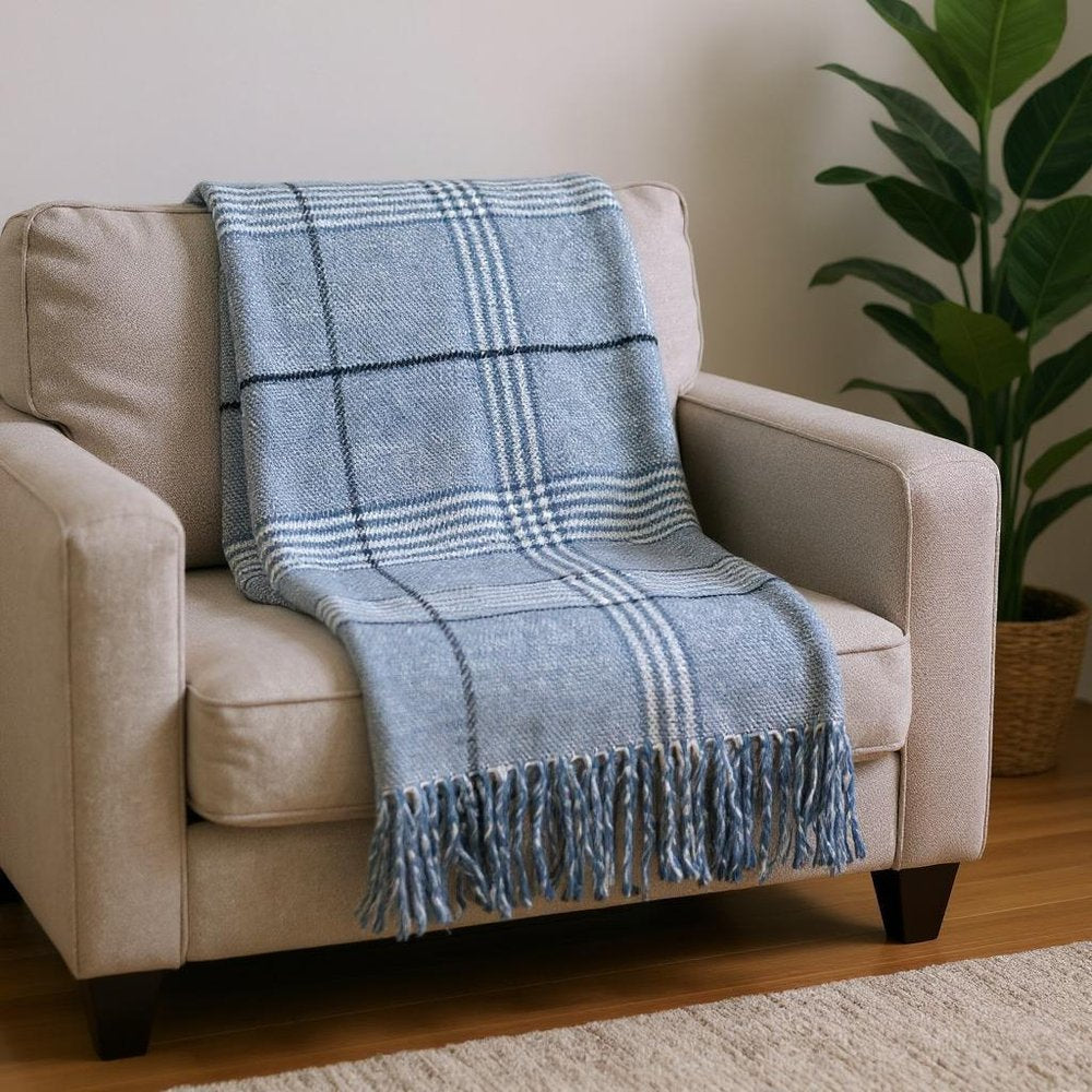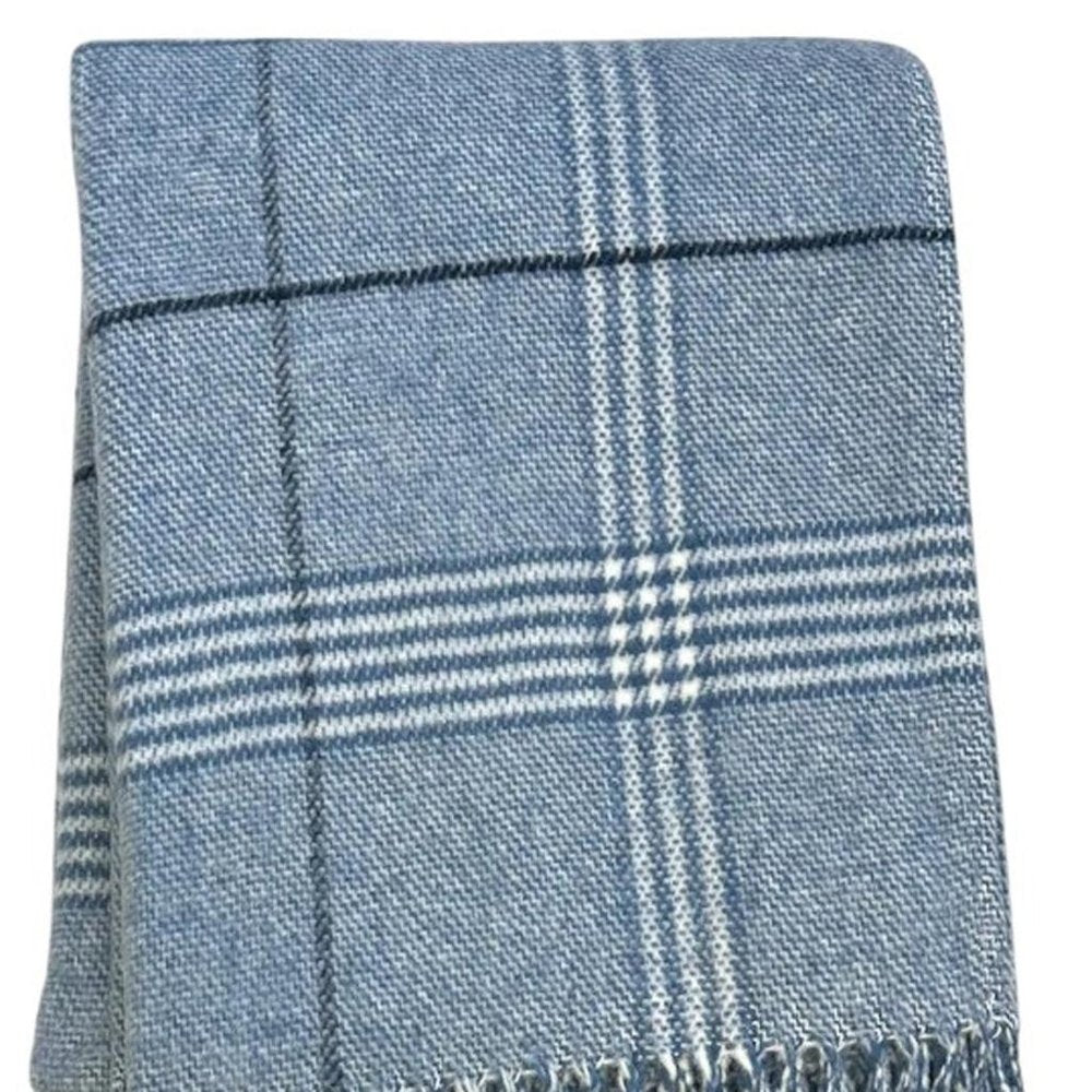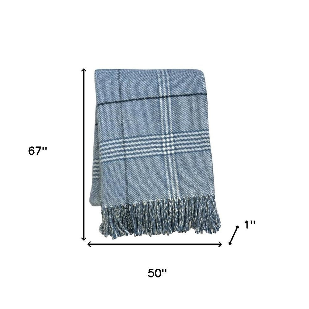 50" X 67" Denim Blue And White Cotton Blend Woven Plaid Throw Blanket with Fringe