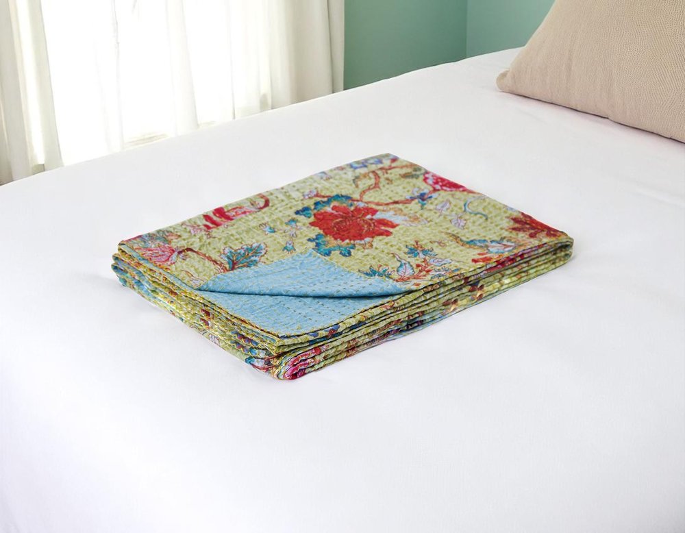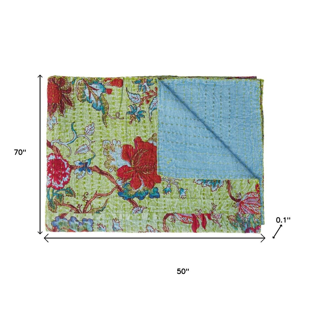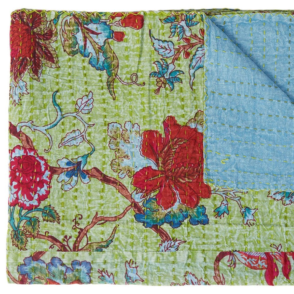50" X 70" Green And Red Floral Cotton Quilted Kantha Throw Blanket with Embroidery