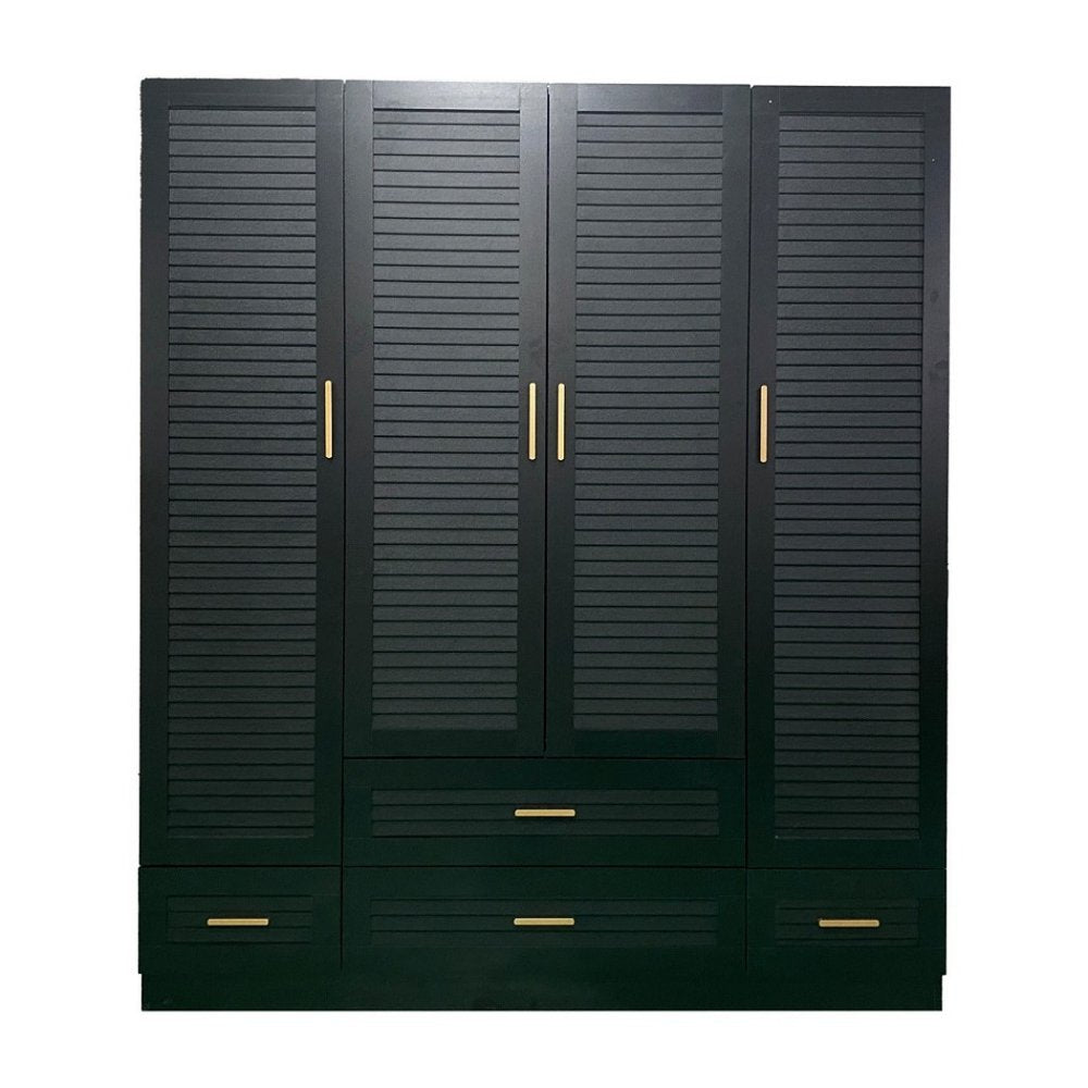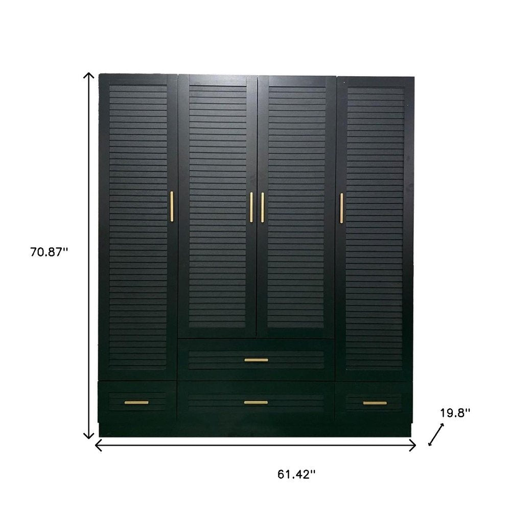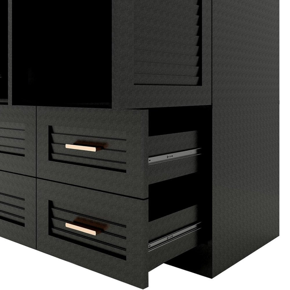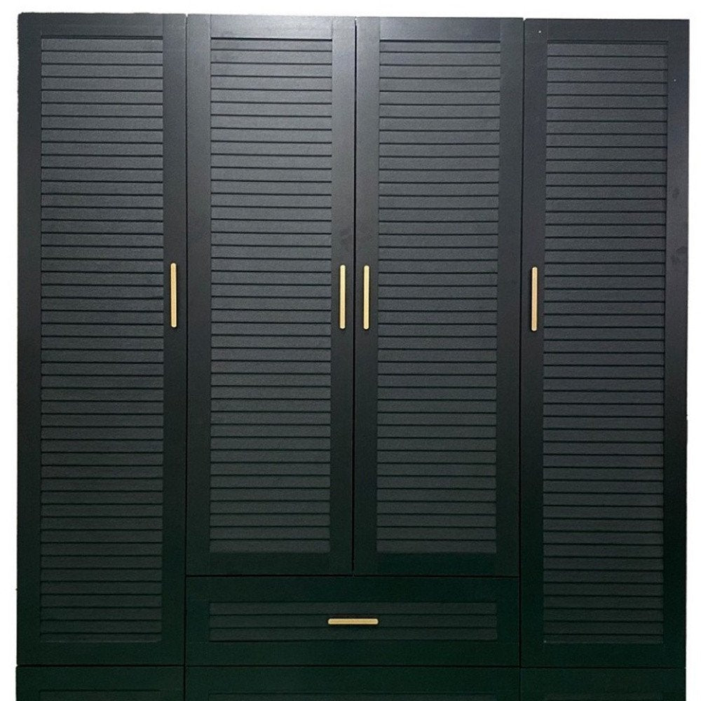 This 71-inch black plantation shutter wood four door four drawer combo dresser is a practical and good-looking accent for your bedroom storage and organizational needs. This combo dresser gives you the added bonus of both drawer storage and cabinet storage to accommodate various sizes and types of items. Equipped with four easy open drawers for practical and good-looking clothing storage. This dresser is made from sturdy manufactured wood that features plantation shutter textural detailing and gold accent hardware that creates a modern and fashionable look for your space. 70.87-inch h x 61.42-inch w x 19.8-inch d.