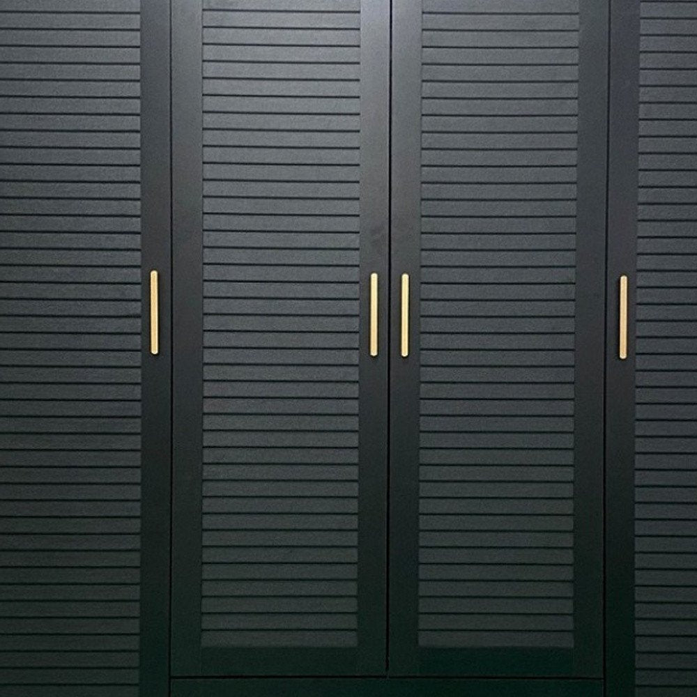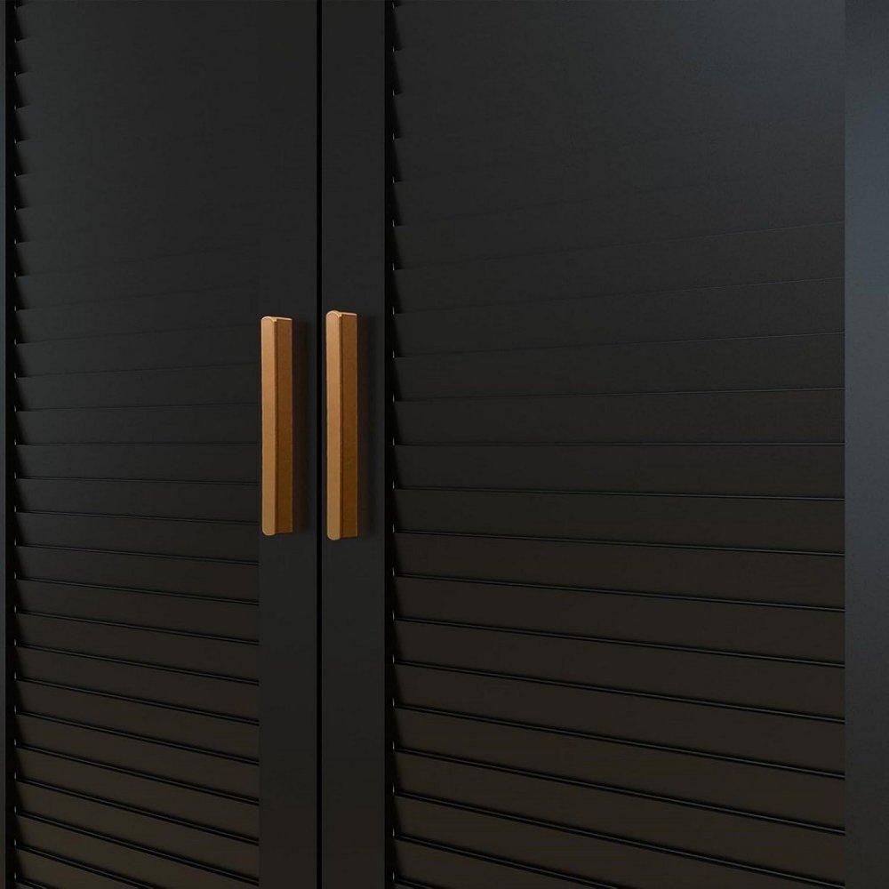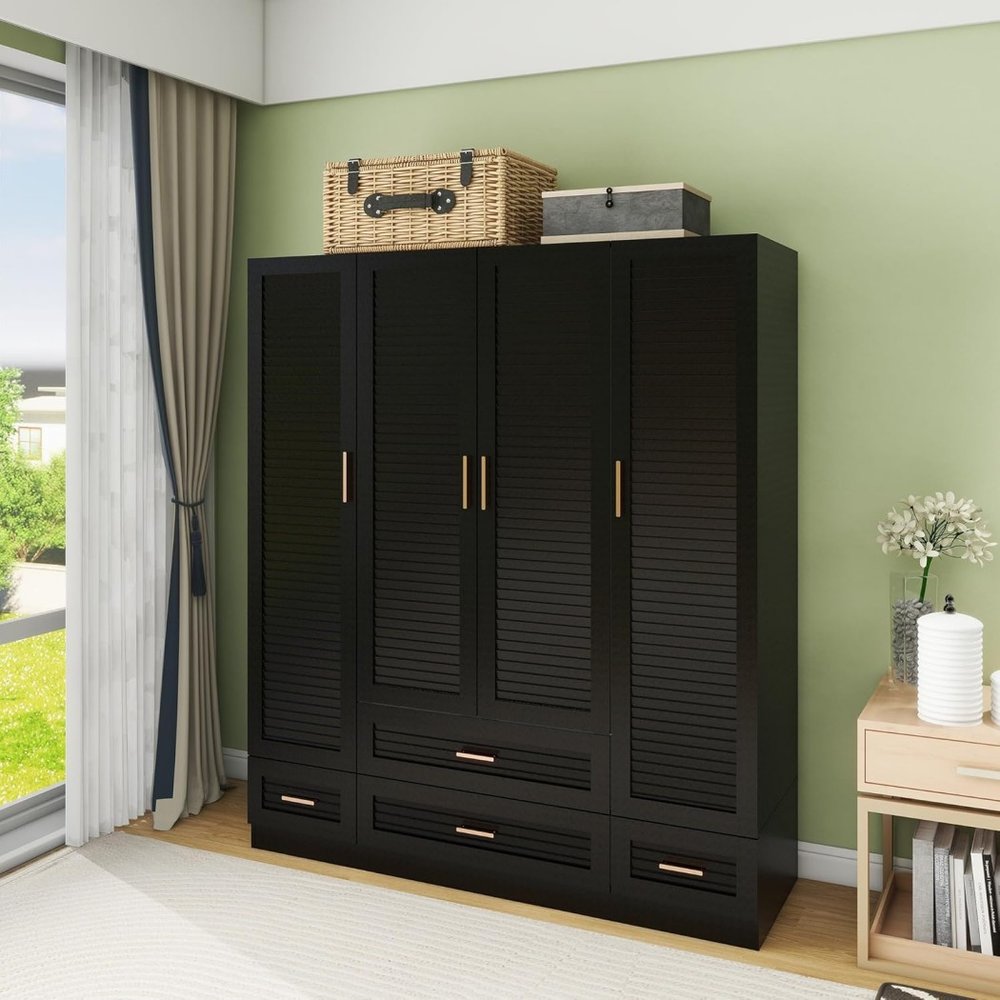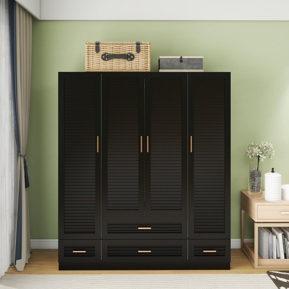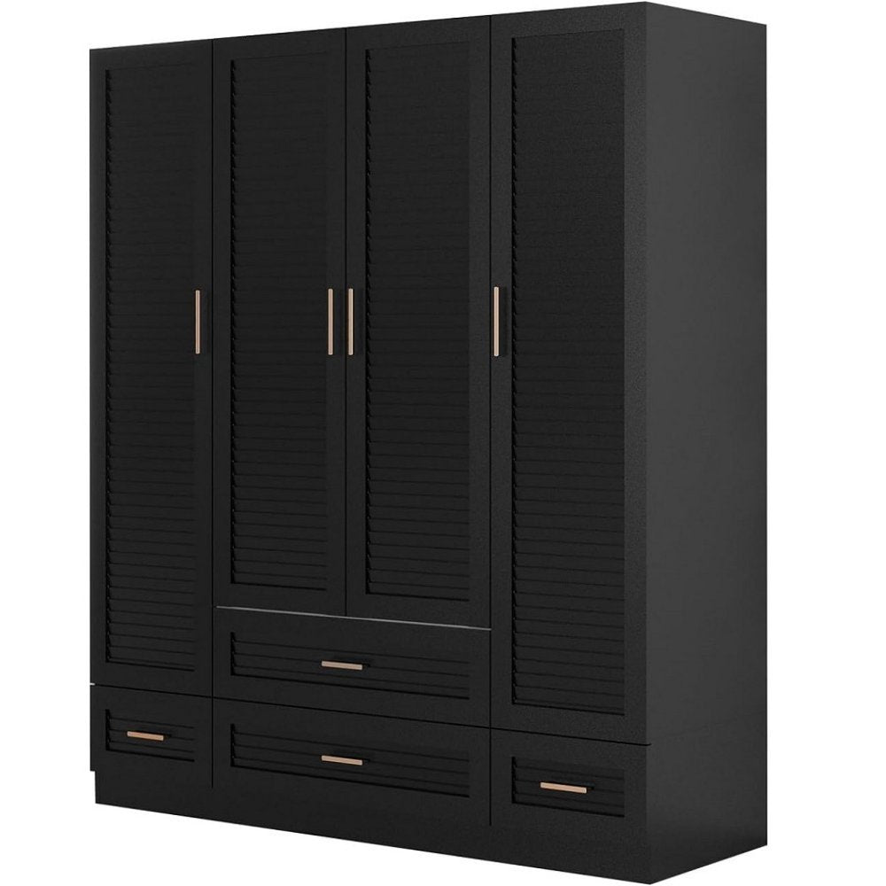 This 71-inch black plantation shutter wood four door four drawer combo dresser is a practical and good-looking accent for your bedroom storage and organizational needs. This combo dresser gives you the added bonus of both drawer storage and cabinet storage to accommodate various sizes and types of items. Equipped with four easy open drawers for practical and good-looking clothing storage. This dresser is made from sturdy manufactured wood that features plantation shutter textural detailing and gold accent hardware that creates a modern and fashionable look for your space. 70.87-inch h x 61.42-inch w x 19.8-inch d.