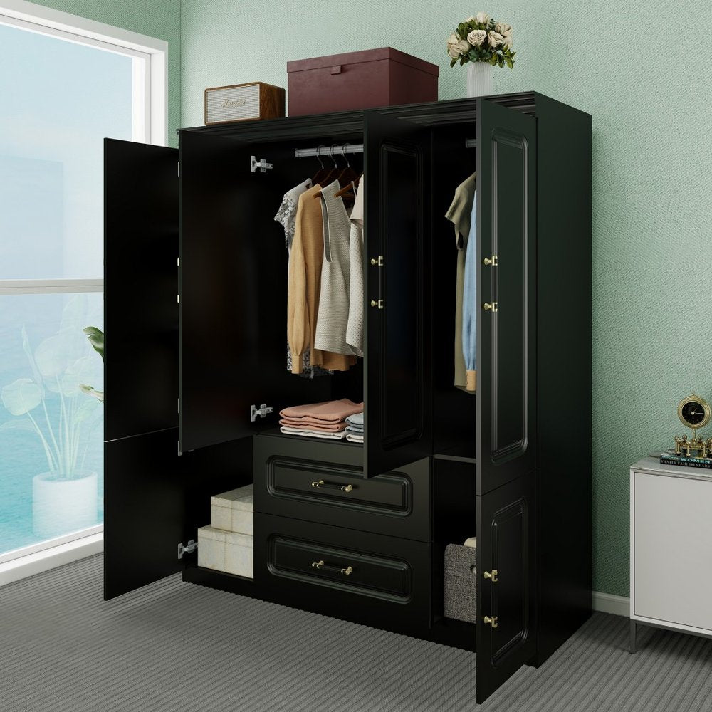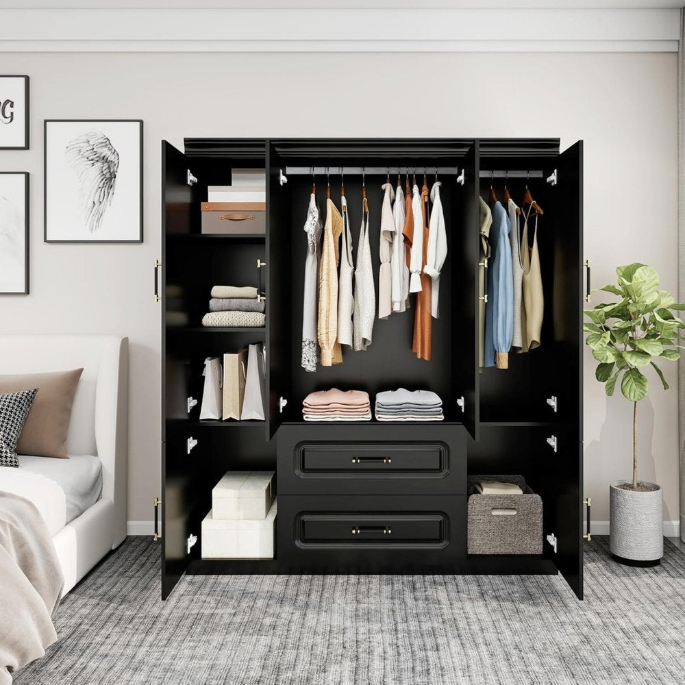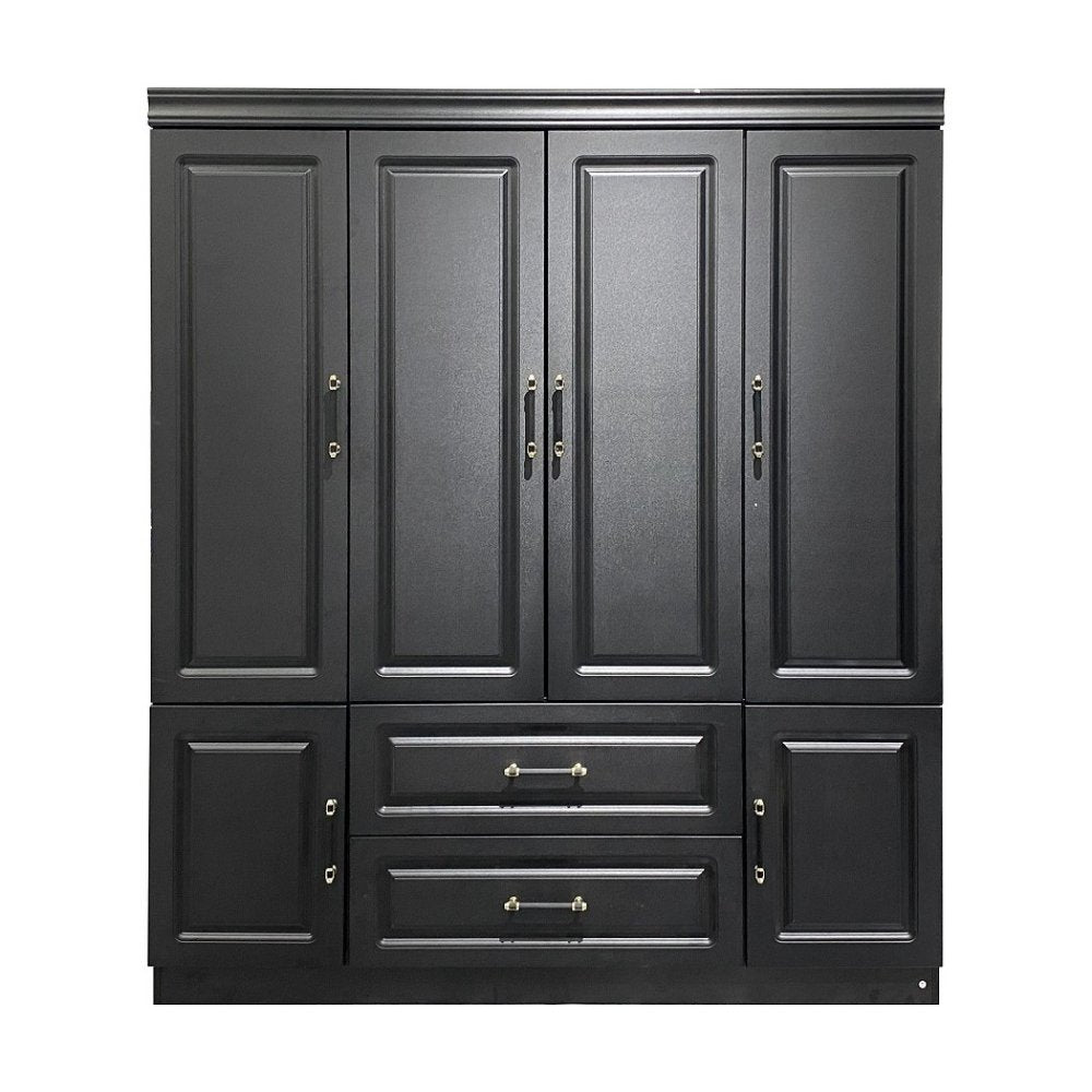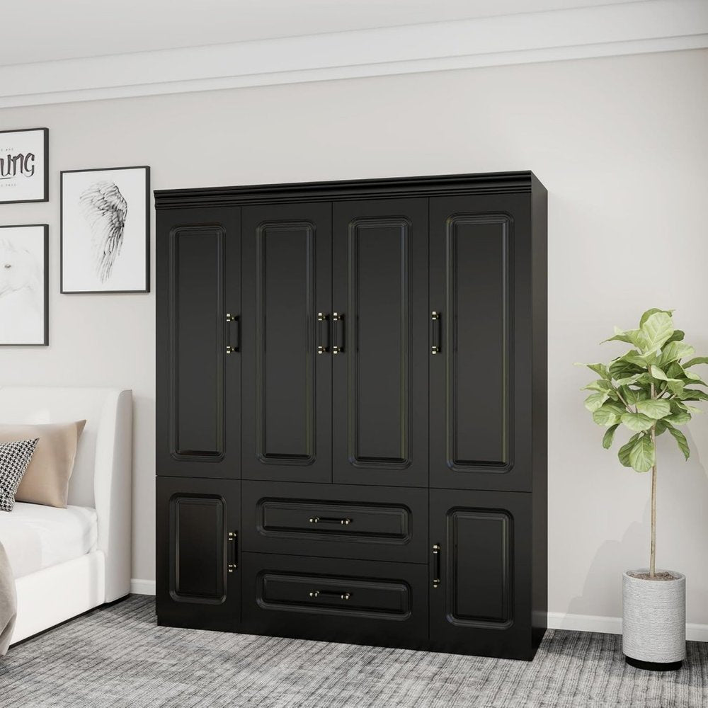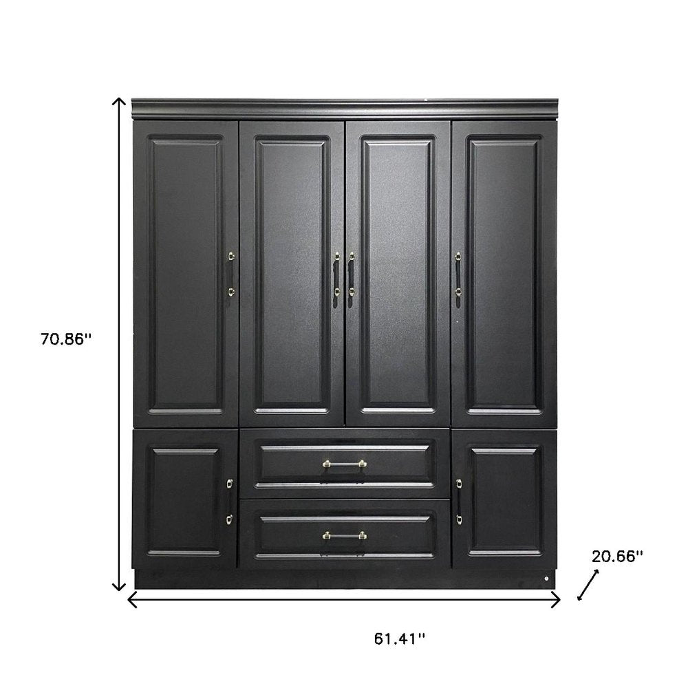 Make your room functional and visually enticing with this masterful 71-inch black wood six door two drawer combo dresser. Versatile in use, this combo dresser is equipped with both drawers and doors for all your storage needs. This dresser is made from sturdy manufactured wood that is built to last. The black coloration of this piece gives it an updated, and modern edge. 70.86-inch h x 61.41-inch w x 20.66-inch d.
