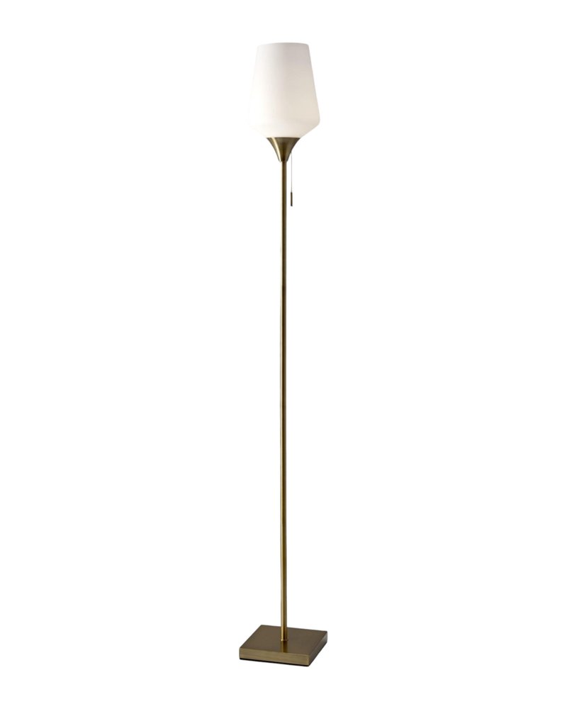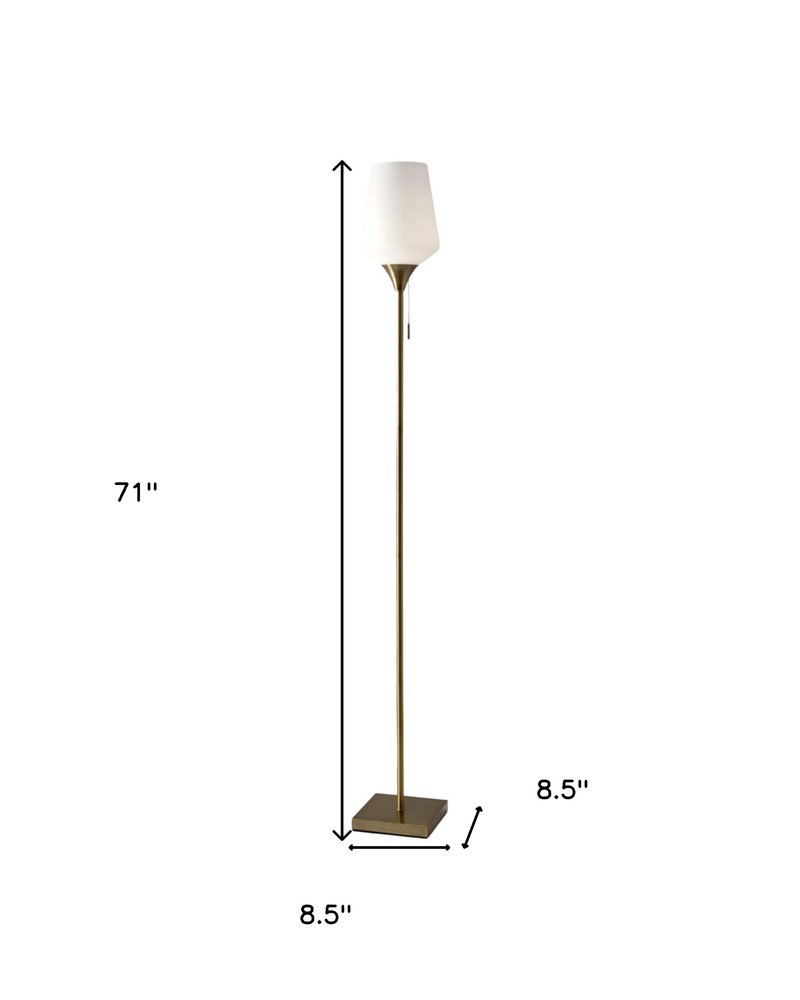 Bring of level of elegance and charm to your space with this good looking 71-inch brass metal torchiere floor lamp with white glass novelty shade. The base of this lamp is made of metal finished in a antiqued tone. The antiqued of this lamp creates a nice contrast with the white glass novelty shaped shade. Add a soft warm glow to your space with this classic torchiere styled lamp. A straight pole extends upwards from a single base while the scooped shade shape refracts light upward and outward much like it's name sake,a torch. Use this lamp anywhere and elevate the look of the whole space. It is perfect for virtually any decor. 71-inch h x 8.5-inch w x 8.5-inch d.