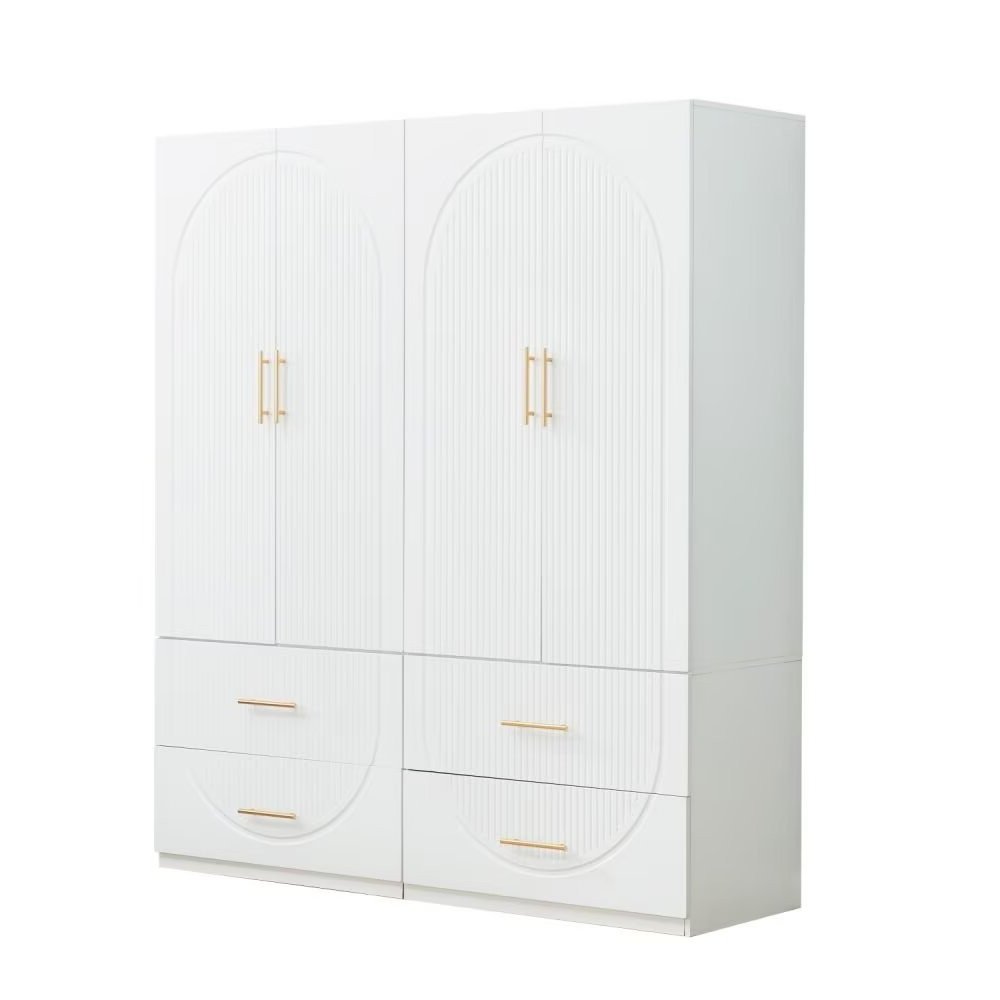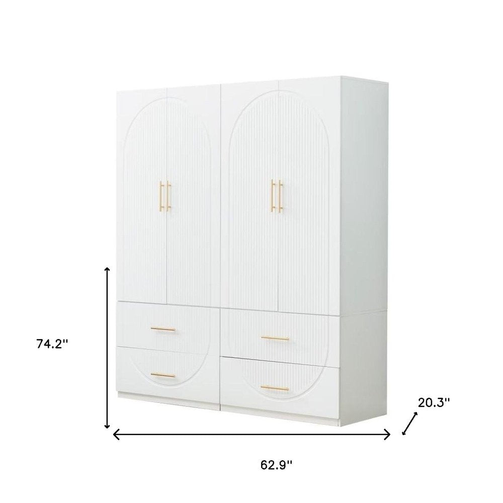 Make your room functional and visually enticing with this masterful 74-inch white carved geometric four door four drawer combo dresser. Versatile in use, this combo dresser is equipped with both drawers and doors for all your storage needs. Equipped with four easy open drawers for practical and good-looking clothing storage. This dresser is made from sturdy manufactured wood that is built to last. The white coloration of this piece is neutral and will blend easily with most any decor. 74.2-inch h x 62.9-inch w x 20.3-inch d.