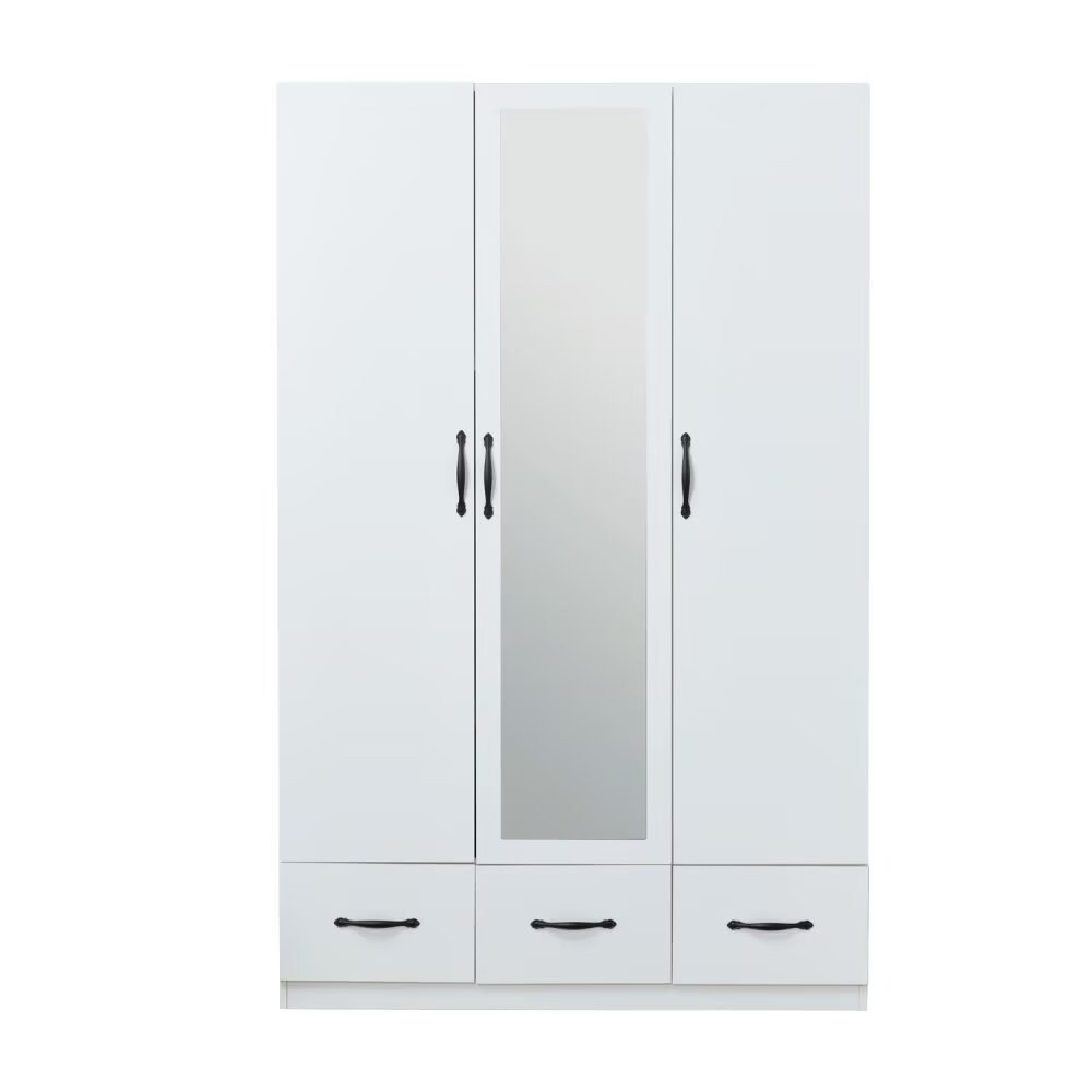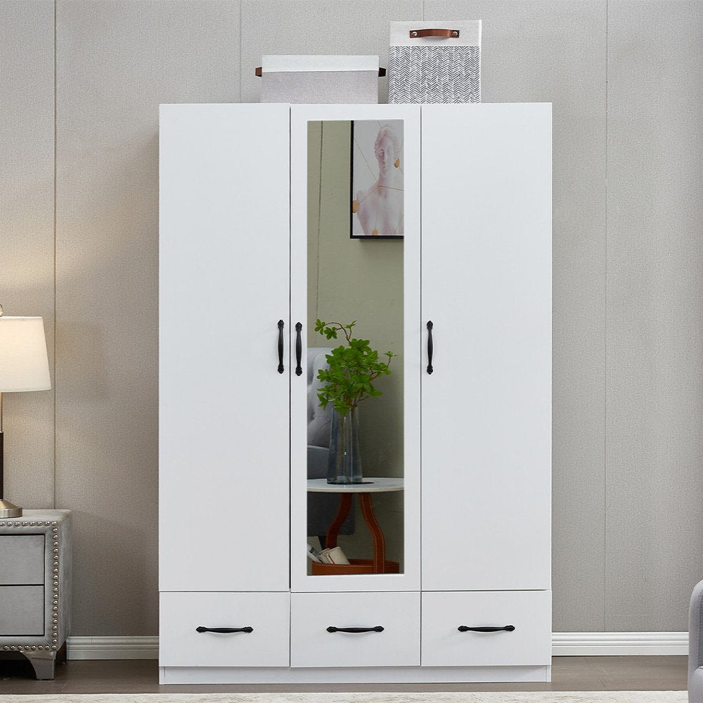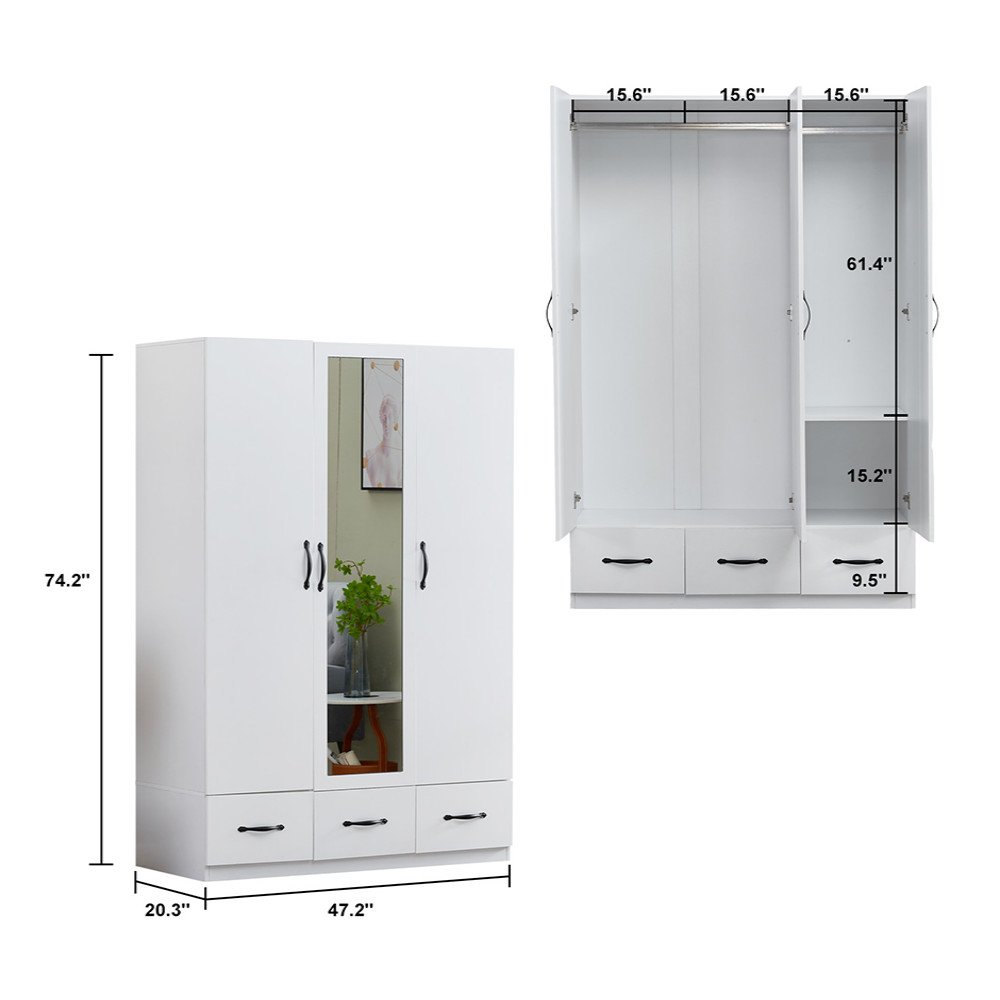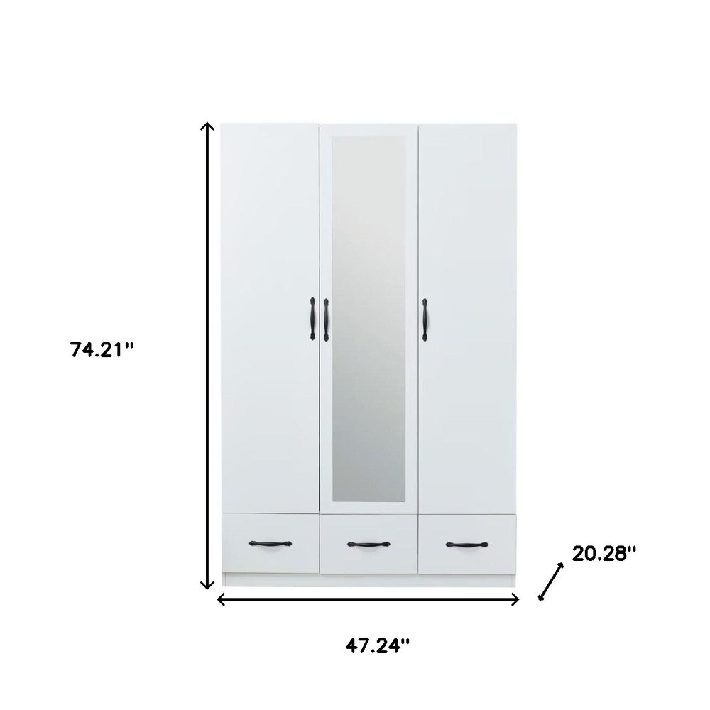 Make your room functional and visually enticing with this masterful 74-inch white mirrored three door three drawer combo dresser. This combo dresser gives you the added bonus of both drawer storage and cabinet storage to accommodate various sizes and types of items. Equipped with three easy open drawers for practical and good-looking clothing storage. This dresser is made from sturdy manufactured wood that is built to last. The white coloration of this piece is neutral and will blend easily with most any decor. 74.21-inch h x 47.24-inch w x 20.28-inch d.