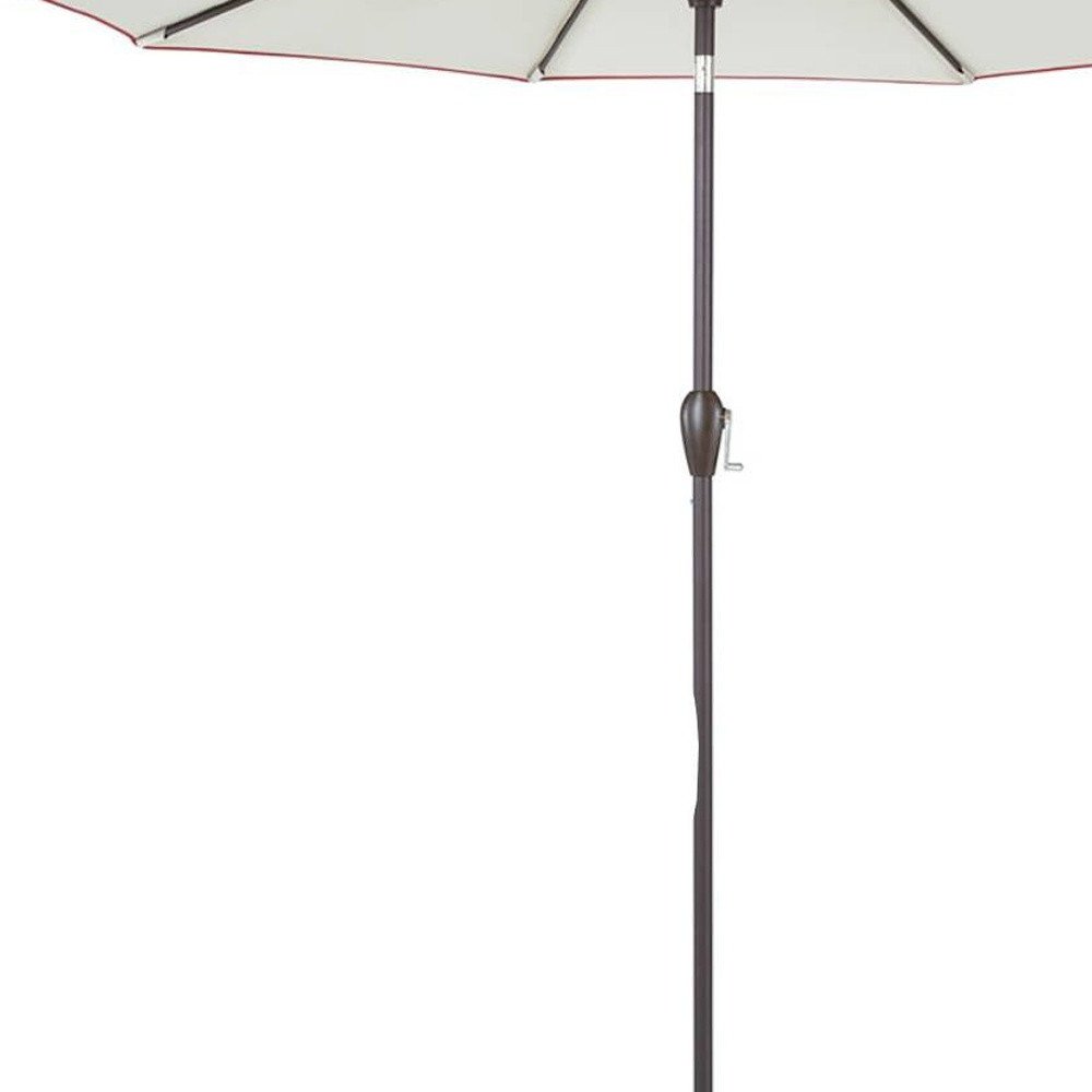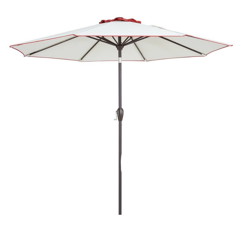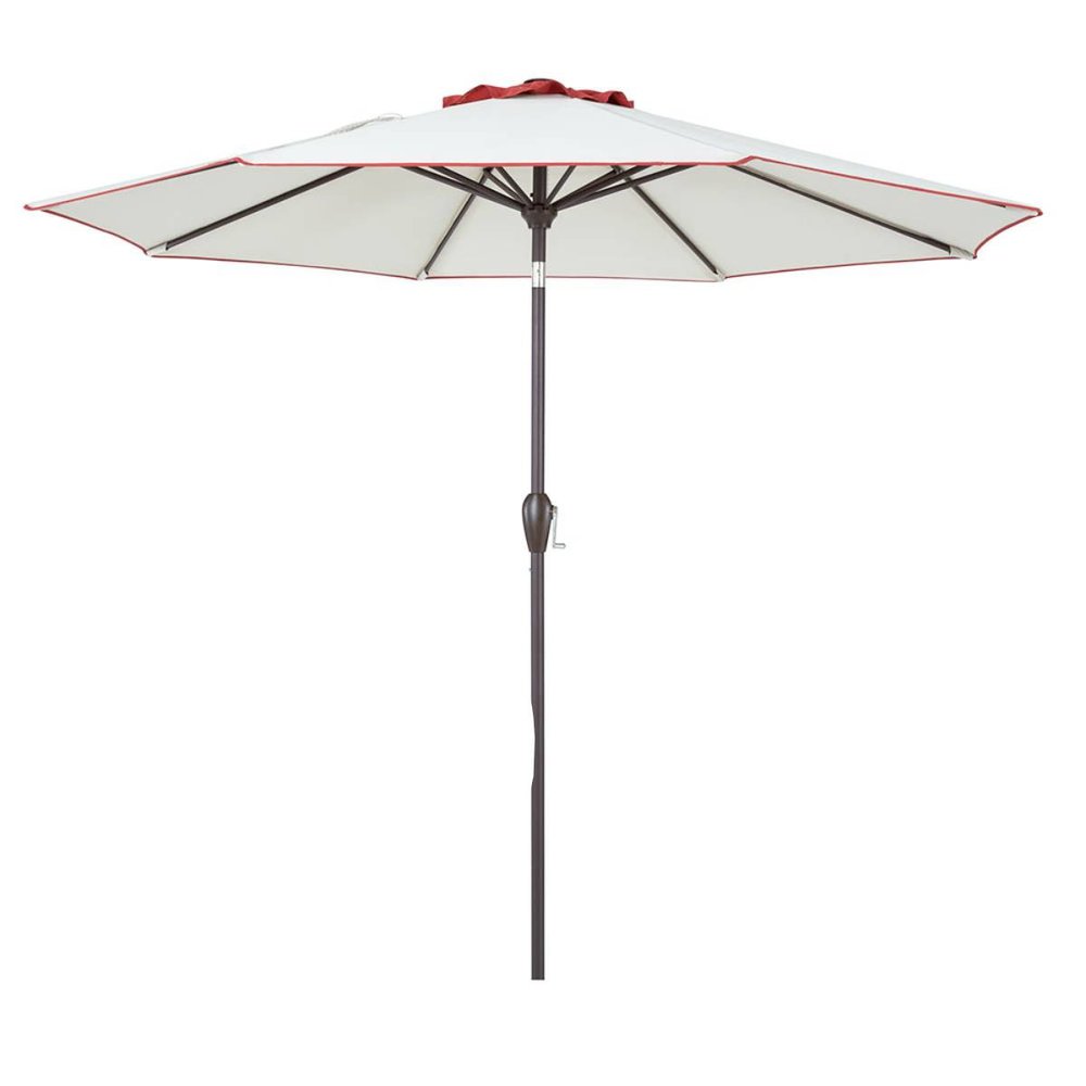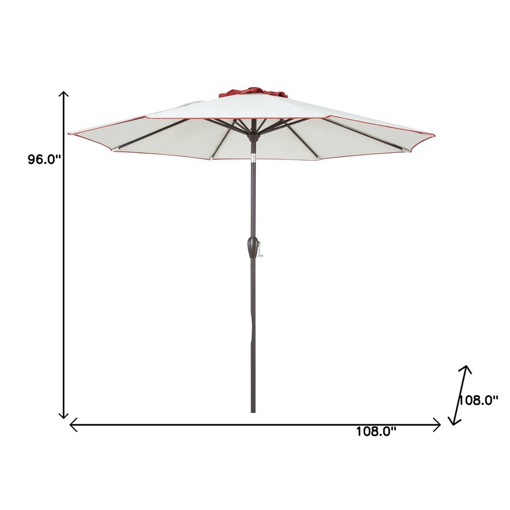 No customer can resist stopping by your store with this unique 9' beige and terracotta polyester octagonal tilt market patio umbrella. This umbrella is made of polyester; a premium quality and durable cloth used on high-end patio furniture and umbrellas. Look no further for the perfect umbrella. This beautiful color will brighten up your day! The pulley lift system makes it extremely easy to open and close. The push button tilt option also means you can tilt the parasol up or down for maximum sun protection. Perfectly sized, this umbrella offers gentle protection from the sun while you relax in your outdoor space. 96" H x 108" W x 108" D