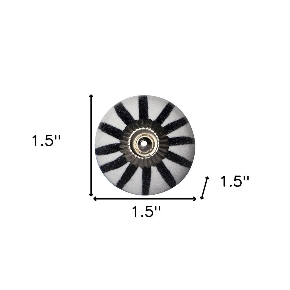 Transform your space quickly and easily with this set of eight black and white ceramic and metal drawer pull knobs. Improve the look of your old boring or builder grade furniture and cabinetry with these high quality round knob traditional style knobs. Hand-painted by talented artisans, these knobs will add a touch of artisanal design. 1.5-inch h x 1.5-inch w x 1.5-inch d.