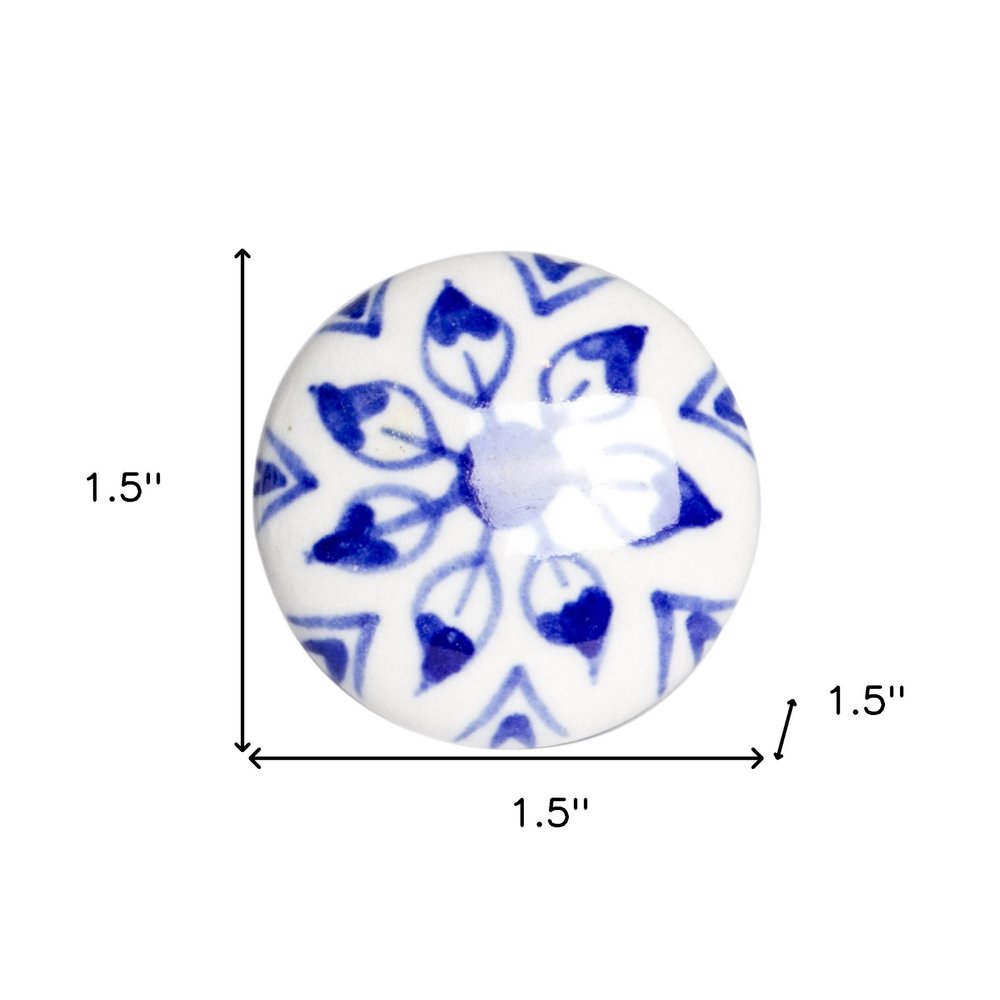 Upgrade your space with a high end look with this set of eight blue and white ceramic and metal drawer pull knobs. A favorite of designers and dyer's alike, these high-quality round knob traditional style knobs are versatile in use and will change up the look of your existing furniture and cabinetry in a snap. Hand-painted by talented artisans, these knobs will add a touch of artisanal design. 1.5-inch h x 1.5-inch w x 1.5-inch d.