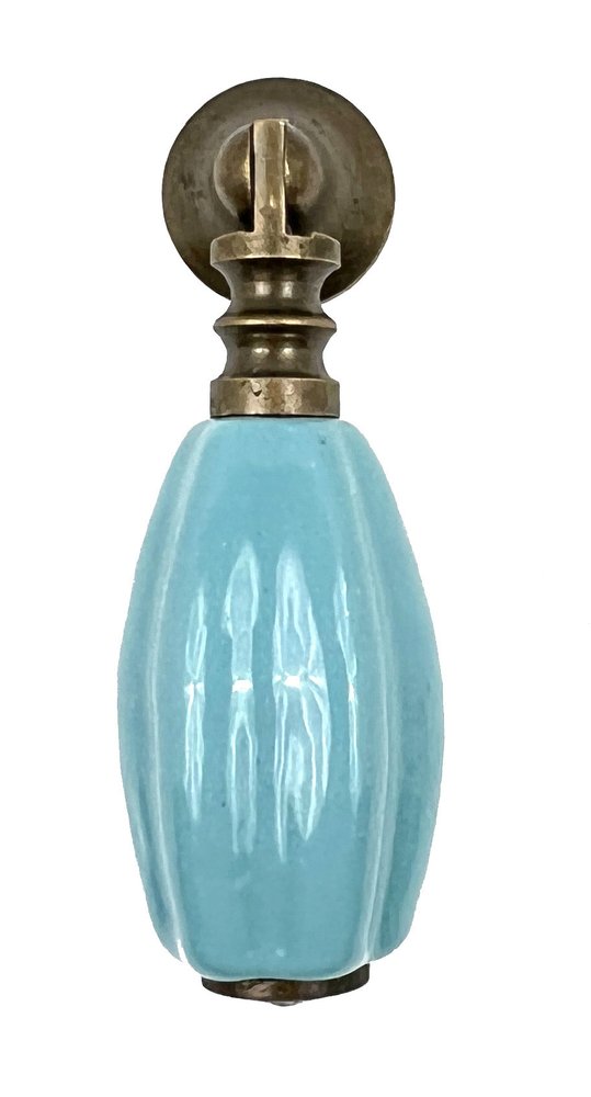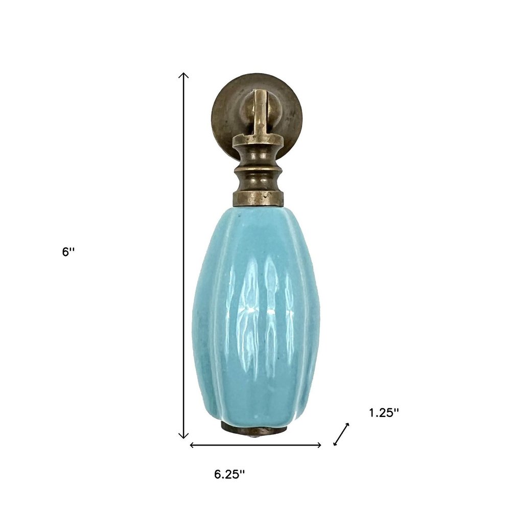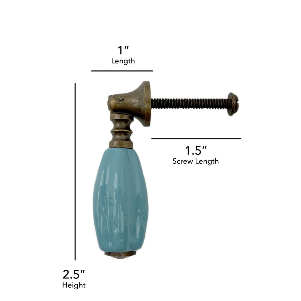 Transform your space quickly and easily with this set of six aqua and brown ribbed ceramic drawer pull knobs. Hand-painted by talented artisans, these knobs will add a touch of artisanal design. The oval shape and vertical hanging design offers a unique aesthetic that enhances both traditional and modern decor. Crafted from high-quality ceramic, these knobs ensure durability while maintaining their vibrant colors. Each set includes screws for effortless installation, making it simple to refresh your furniture. Elevate your cabinetry or furniture with this charming and practical accessory that combines style with functionality. 6-inch h x 6.25-inch w x 1.25-inch d.