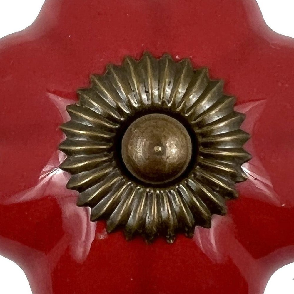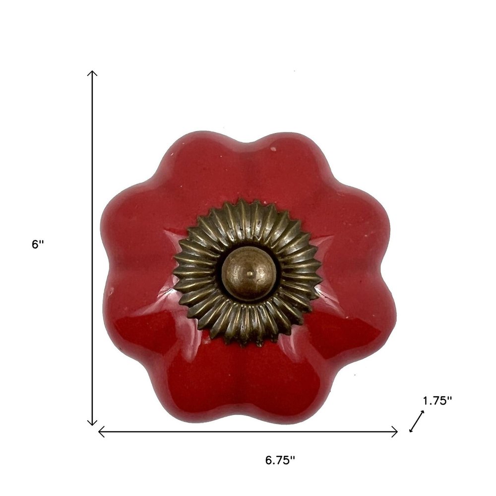 Upgrade your space with a high end look with this set of six red flower shape ceramic drawer pull knobs. Hand-painted by talented artisans, these knobs will add a touch of artisanal design. Each floral knob showcases a unique pattern and intricate detailing, enriching your furniture with elegance. Crafted from durable ceramic, these knobs ensure longevity while enhancing aesthetic appeal. The included screws make installation effortless, allowing you to quickly refresh your cabinetry or drawers. Perfect for adding a whimsical touch to any room in your home, these knobs will transform your decor. 6-inch h x 6.75-inch w x 1.75-inch d.