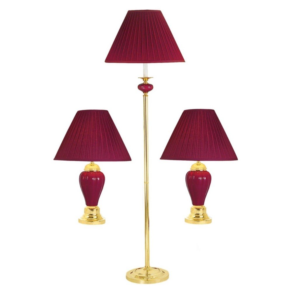 Embrace the good life with this hard working and stylish set of three 64" gold ceramic bedside floor and table lamp set with red empire shade. The lamp is made of sturdy ceramic and features a gold color. Includes a red fabric, empire shaped shade, making this a fashionable piece that will complement most any interior. Bedside table lamps help to add a soft and cozy glow to your bedroom. Great for evening reading! The light that this lamp throws is soft and warm to elevate the look of most any space in your home. It is perfect for virtually any decor. 64" H x 10" W x 10" D
