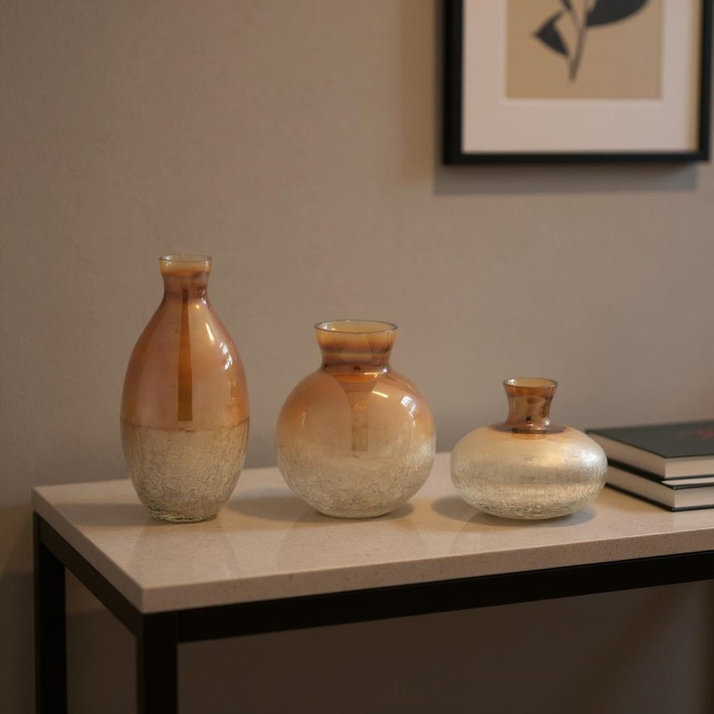 This set of three beige and brown crackle glaze glass table vases brings a touch of modern elegance to your home decor. Each bottle neck vase is crafted from high-quality glass, showcasing a beautiful crackle glaze finish that adds texture and visual interest. Perfect for displaying fresh or dried flowers, this versatile set enhances any dining table, coffee table, or shelf. With three pieces included, you can arrange them in various ways to create a stunning centerpiece or a cohesive look throughout your space. The neutral tones of amber, brown, and clear effortlessly complement a range of interior styles, making these vases a charming addition to any room. Elevate your decor with this stylish and functional vase set. 4.25-inch h x 4.75-inch w x 4.75-inch d.