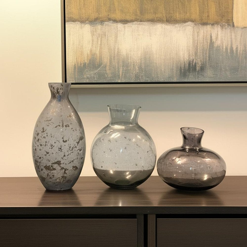 Set of three blue and gray seeded glass table vases offers a stunning blend of color and texture. The bud shape of these vases makes them perfect for showcasing your favorite floral arrangements. Crafted from seeded glass, they provide a unique visual appeal that complements various decor styles. This transitional design effortlessly enhances both modern and traditional interiors. Included in the set are three distinct pieces, allowing for versatile arrangement options throughout your home. The combination of blue and gray tones adds a calming touch, making them ideal for any setting. Elevate your living space with this stylish trio that brings both elegance and functionality to your decor.